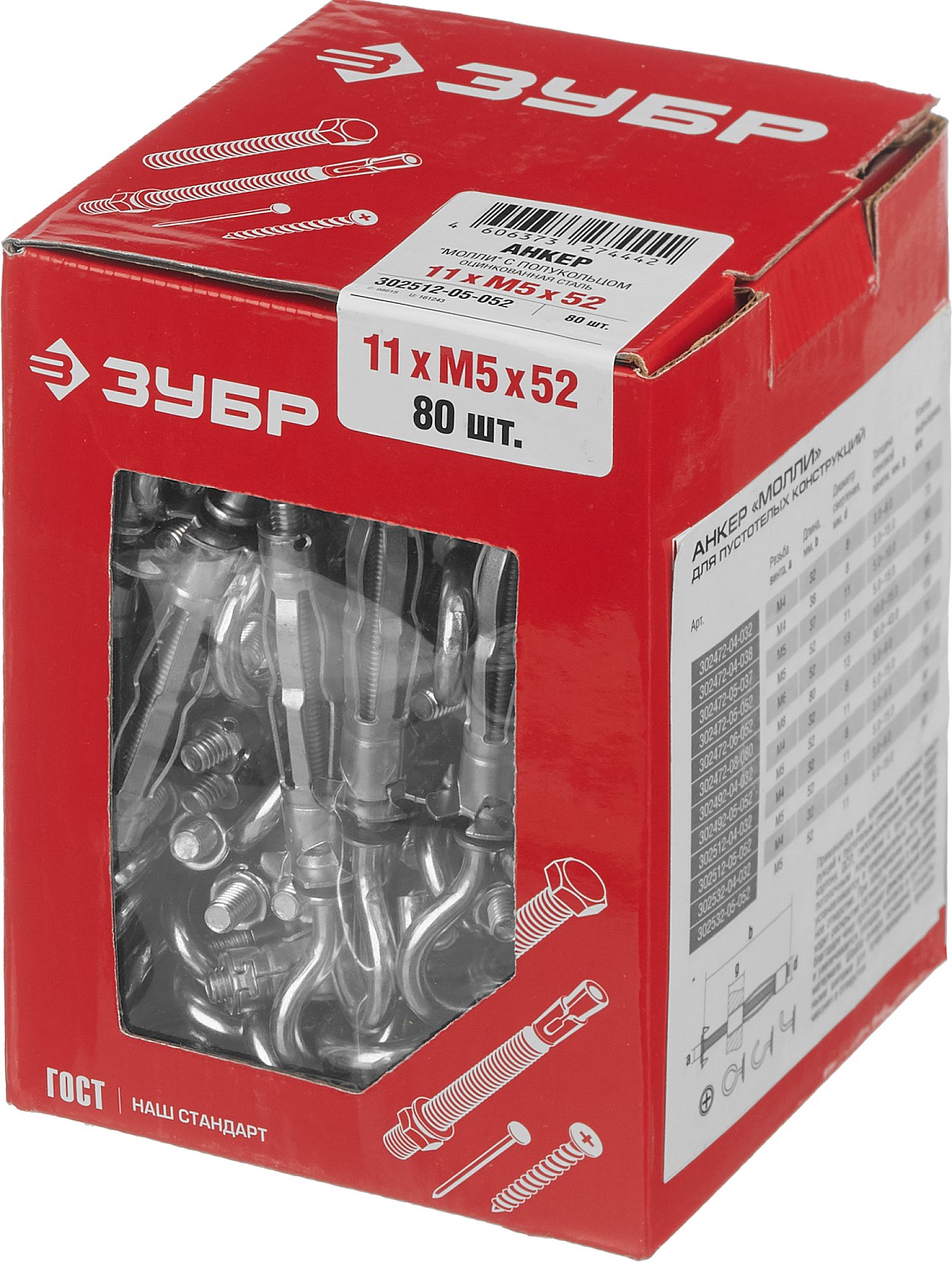 Анкер МОЛЛИ для пустотелых материалов, с полукольцом, 11 мм х M5 x 52 мм, 80 шт, оцинкованный, ЗУБР - 302512-05-052