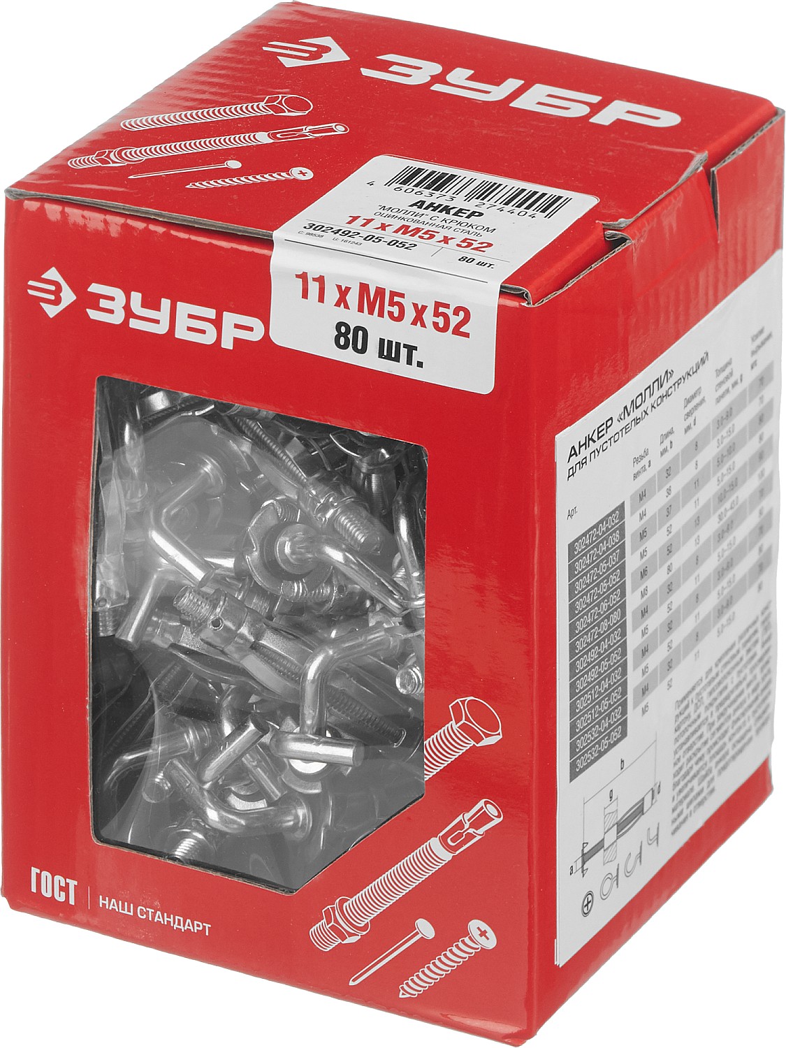 Анкер МОЛЛИ для пустотелых материалов, с крюком, 11 мм х M5 x 52 мм, 80 шт, оцинкованный, ЗУБР - 302492-05-052