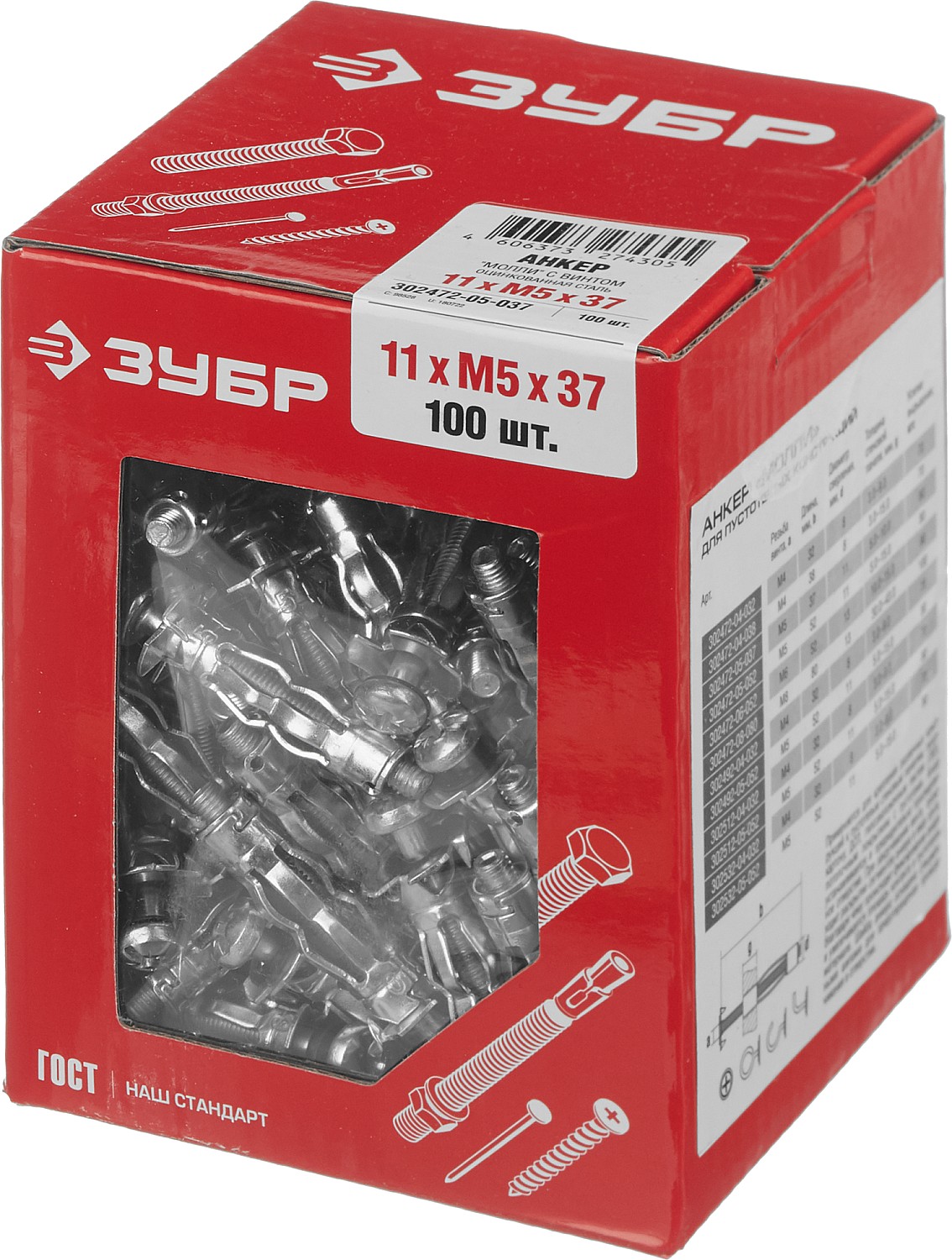 Анкер МОЛЛИ для пустотелых материалов, 11 мм x M5 x 37 мм, 100 шт, оцинкованный, ЗУБР - 302472-05-037