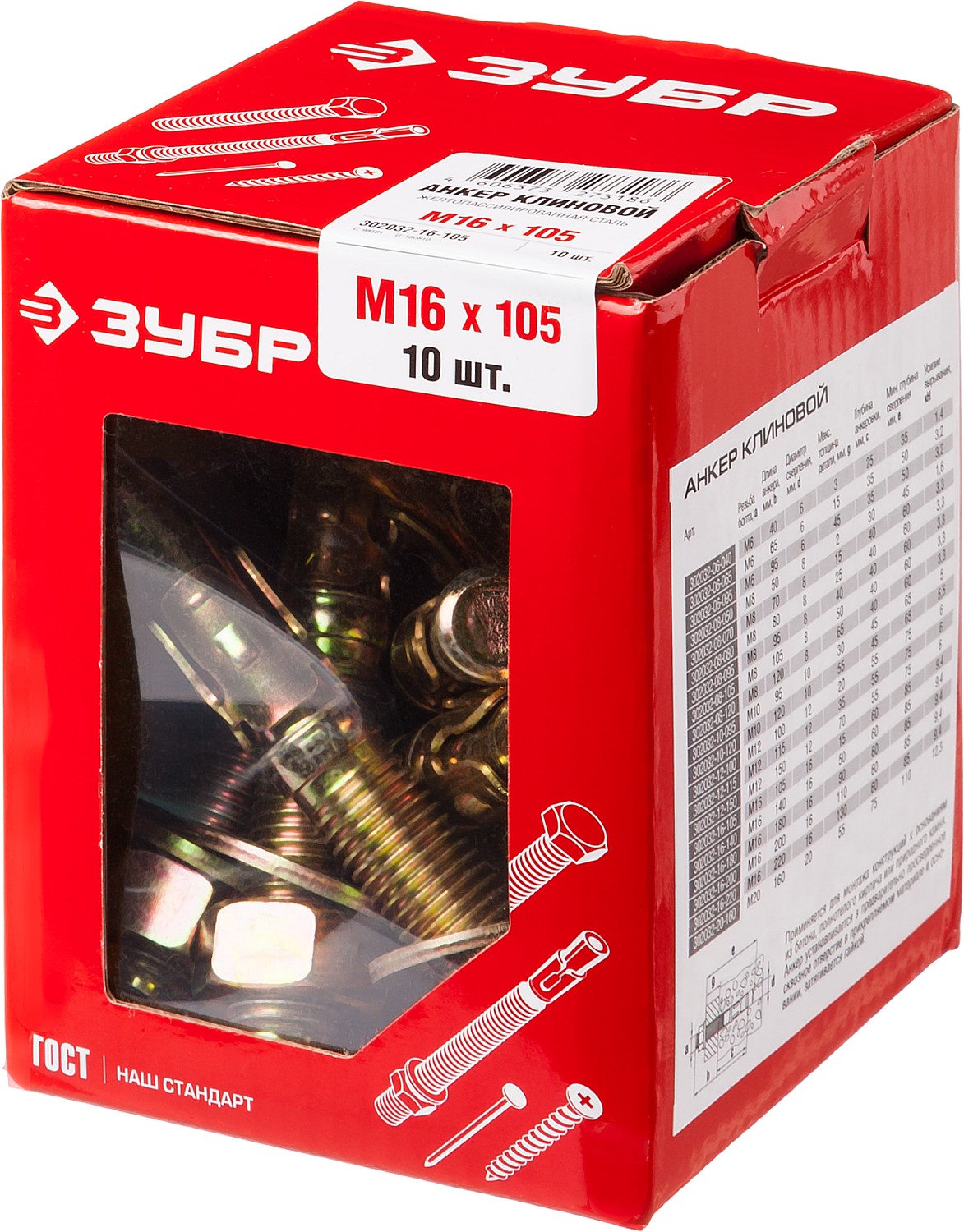 Анкер клиновой, М16 x 105 мм, 10 шт, желтопассивированный, ЗУБР - 302032-16-105