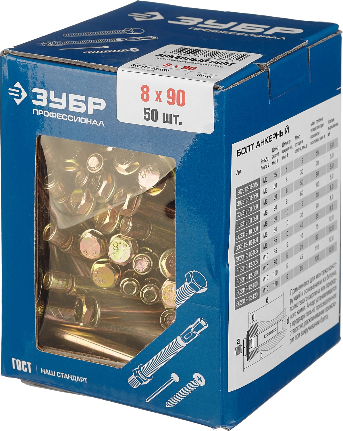 Болт анкерный, 8 x 90 мм, 50 шт, желтопассивированный, ЗУБР Профессионал - 302312-08-090
