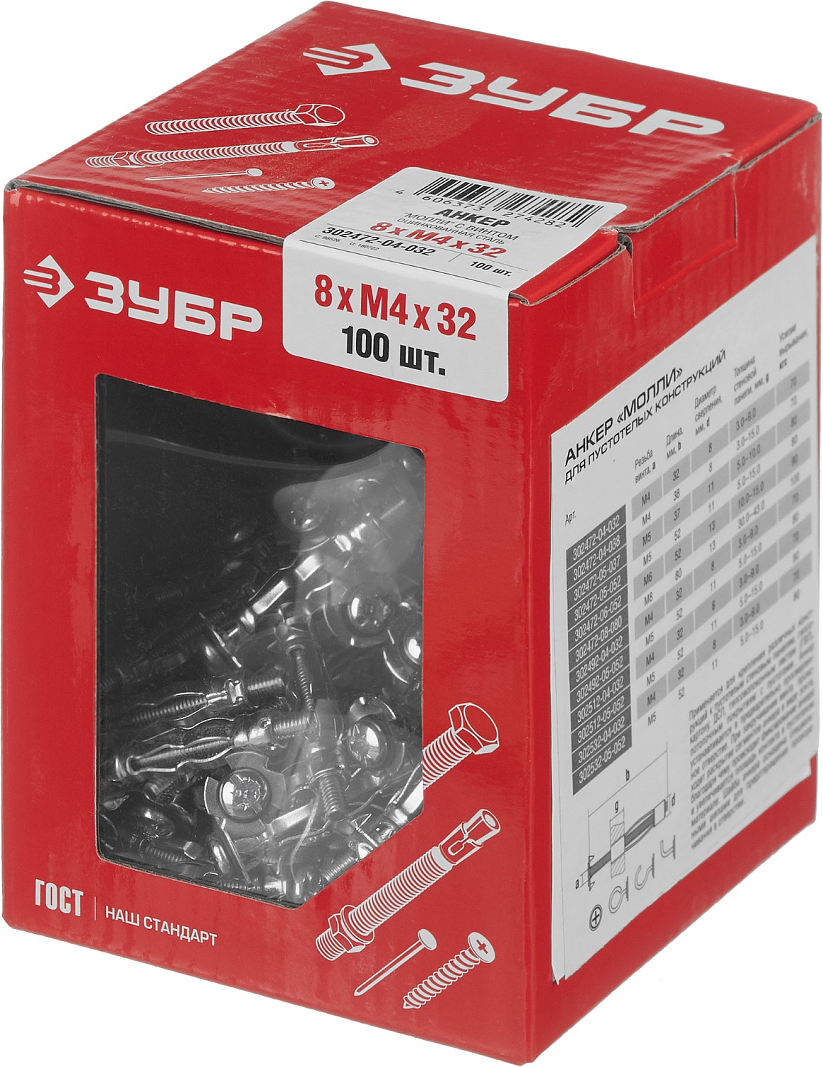 Анкер МОЛЛИ для пустотелых материалов, 8 мм x M4 x 32мм, 100 шт, оцинкованный, ЗУБР - 302472-04-032