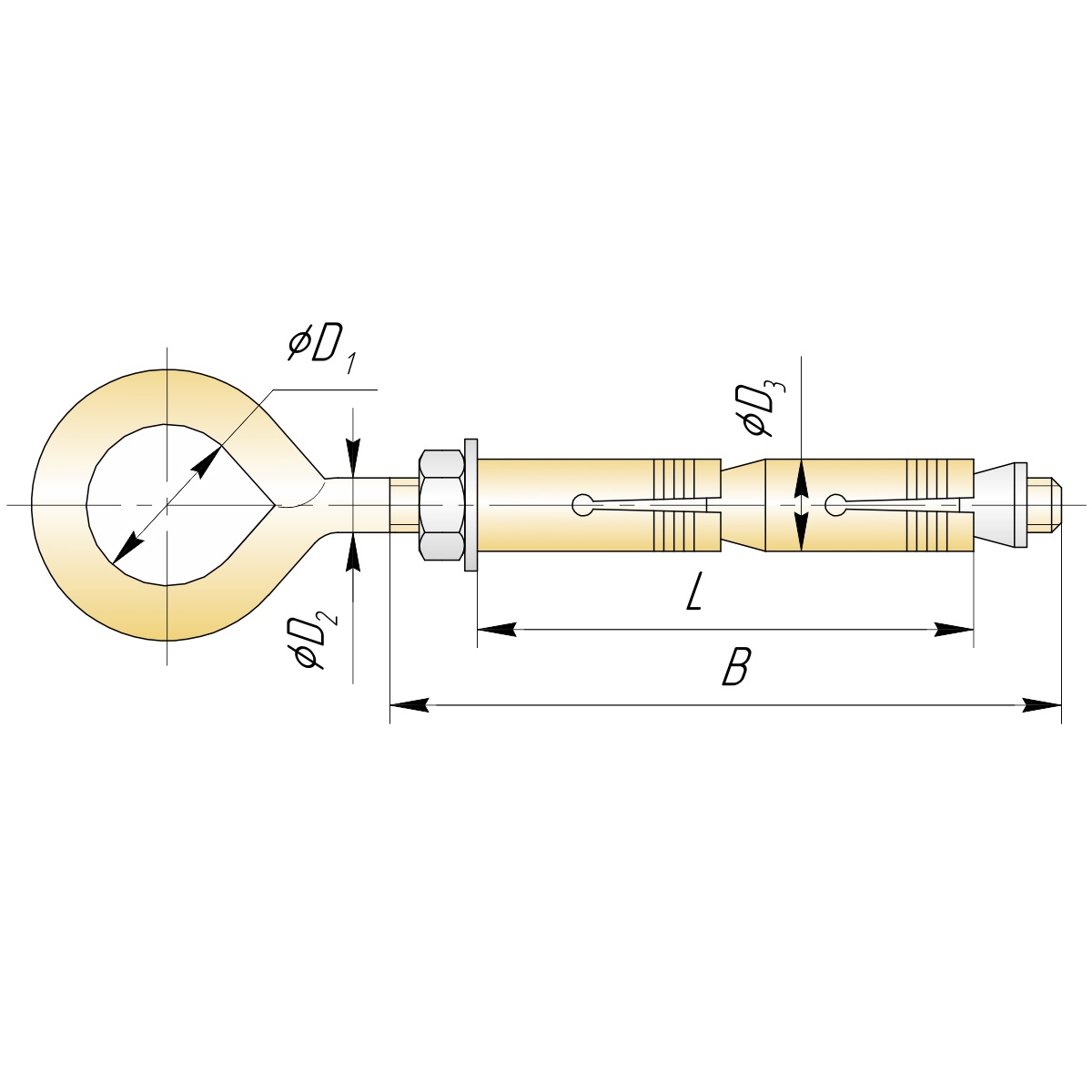 Двухраспорный анкер с кольцом состоит из шпильки с резьбой с одной стороны и заваренным кольцом с другой, как и обычный двухраспорник он имеет 2 или 3 распорные гильзы и распорную часть на конус снизу. Обязательно комплектуется гайкой расположенной на шпильке между кольцом и рубашкой, так как процесс монтажа потребует значительных усилий.
