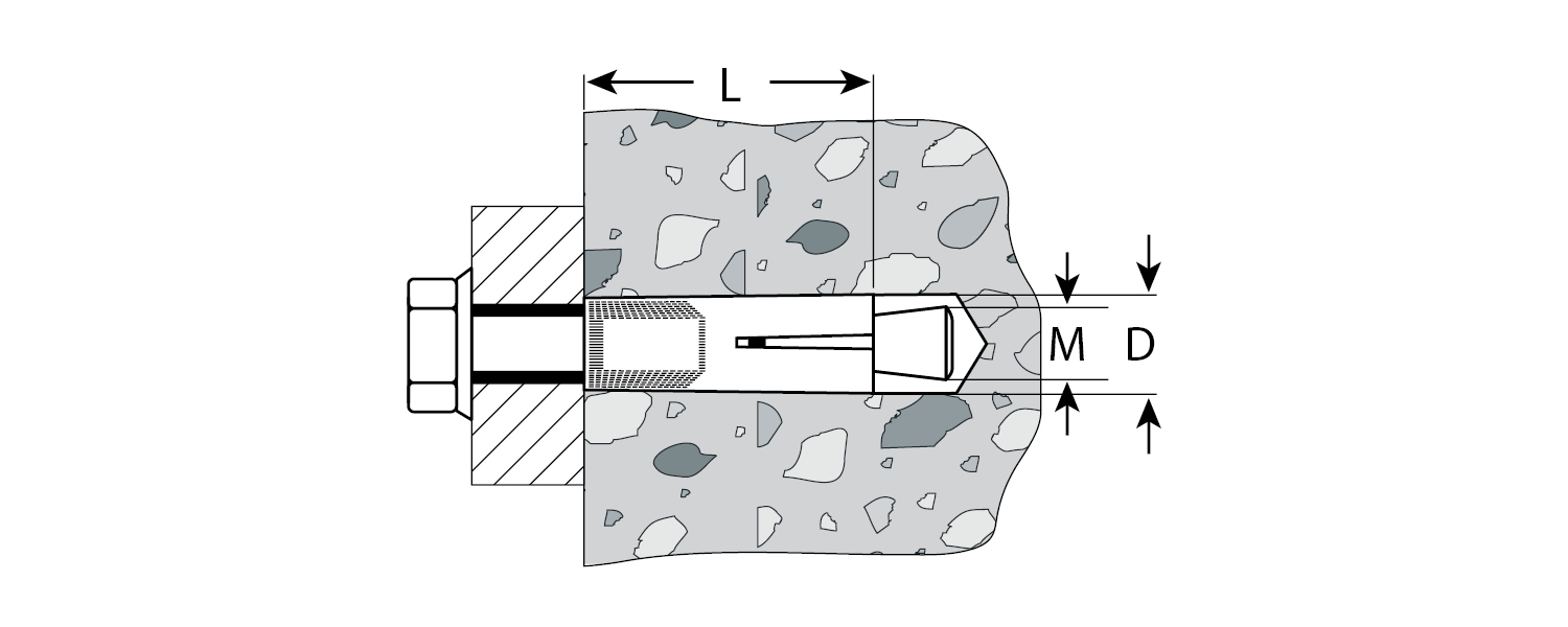 Анкер забивается в предварительно просверленное отверстие и расклинивается при вворачивании болта;