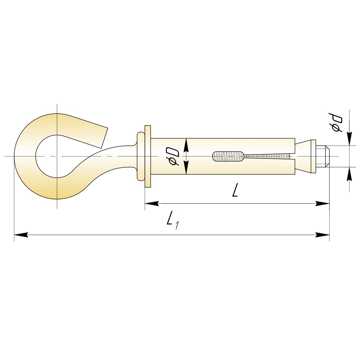 Данный вид анкера используют для крепления подвесных конструкций с применением гибких элементов, таких как цепи, тросы и канаты. Используются анкерные болты на строительных площадках.¶ Изделие состоит из таких элементов как распорный конус с внутренней резьбой, болт с головкой-кольцом, гайка и распорный конус.¶Анкерный болт с кольцом пользуется большой популярностью, за счет удобства монтажа и надежности крепления.