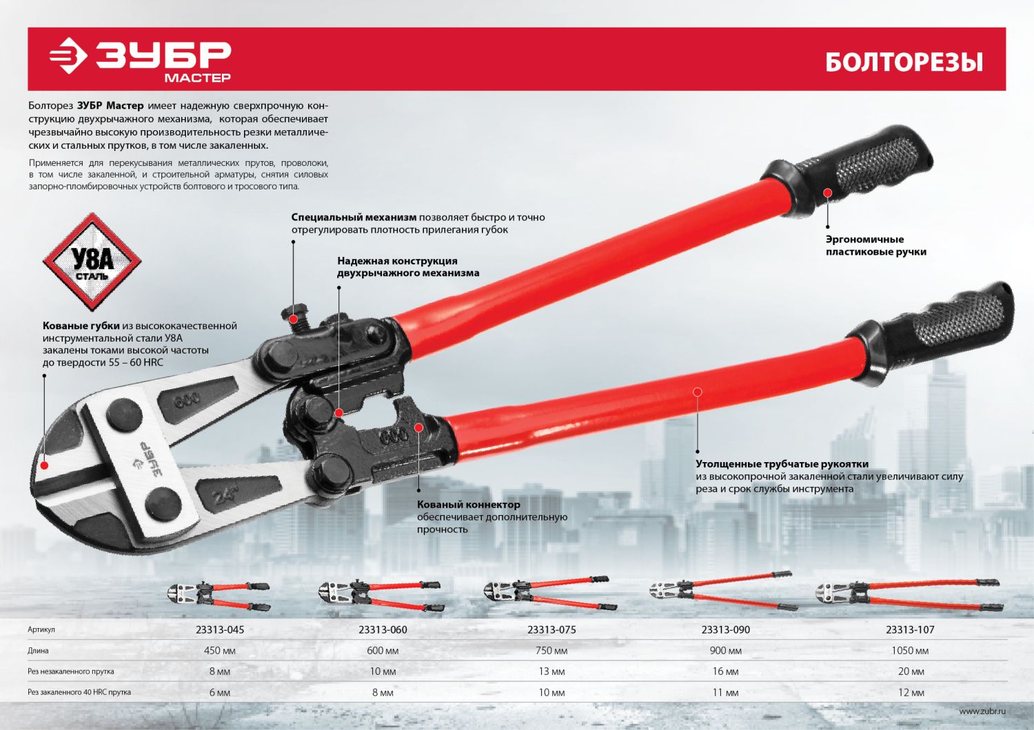 Губки изготовлены из высококачественной хромомолибденовой стали и закалены токами высокой частоты до твердости 55-60 HRC. Надежная конструкция двухрычажного механизма и применение высокопрочной закаленной стали в рукоятках болторезов увеличивает силу реза и срок службы инструмента.Чрезвычайно высокая производительность резки металлических и стальных прутков, в том числе закаленных, обеспечивается надежной и прочной конструкцией двухрычажного механизма.-Незакаленная проволока: 13 мм
