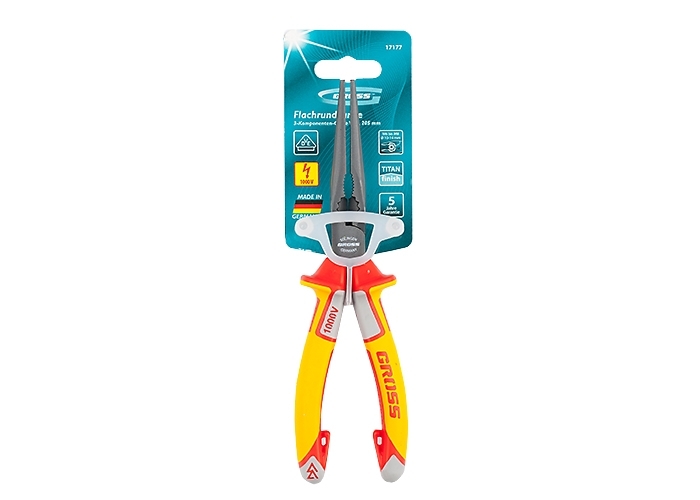 Длинногубцы торговой марки GROSS предназначены для проведения слесарных и электромонтажных работ (точечного захвата проволоки, металлической жилы, прутка, кусков металла пр.). Грани у основания губок длинногубцев позволяют использовать инструмент как гаечный ключ М6–М8. Нижние части рукояток оснащены дополнительными упорами, на которые можно установить пружину для автоматического разжима либо скобу с подвесом. Длинногубцы общей длиной 205 мм изготовлены из высококачественной конструкционной стали С45 твердостью 62 HRC. На металлическую основу инструмента нанесено специальное антикоррозийное покрытие Titan finish. Диэлектрические трехкомпонентные рукоятки позволяют использовать инструмент под напряжением до 1000 В, что соответствует стандартам VDE, IEC 60900. Подвесная карта обеспечивает удобное размещения на стенде. На длинногубцы распространяется пятилетняя гарантия.