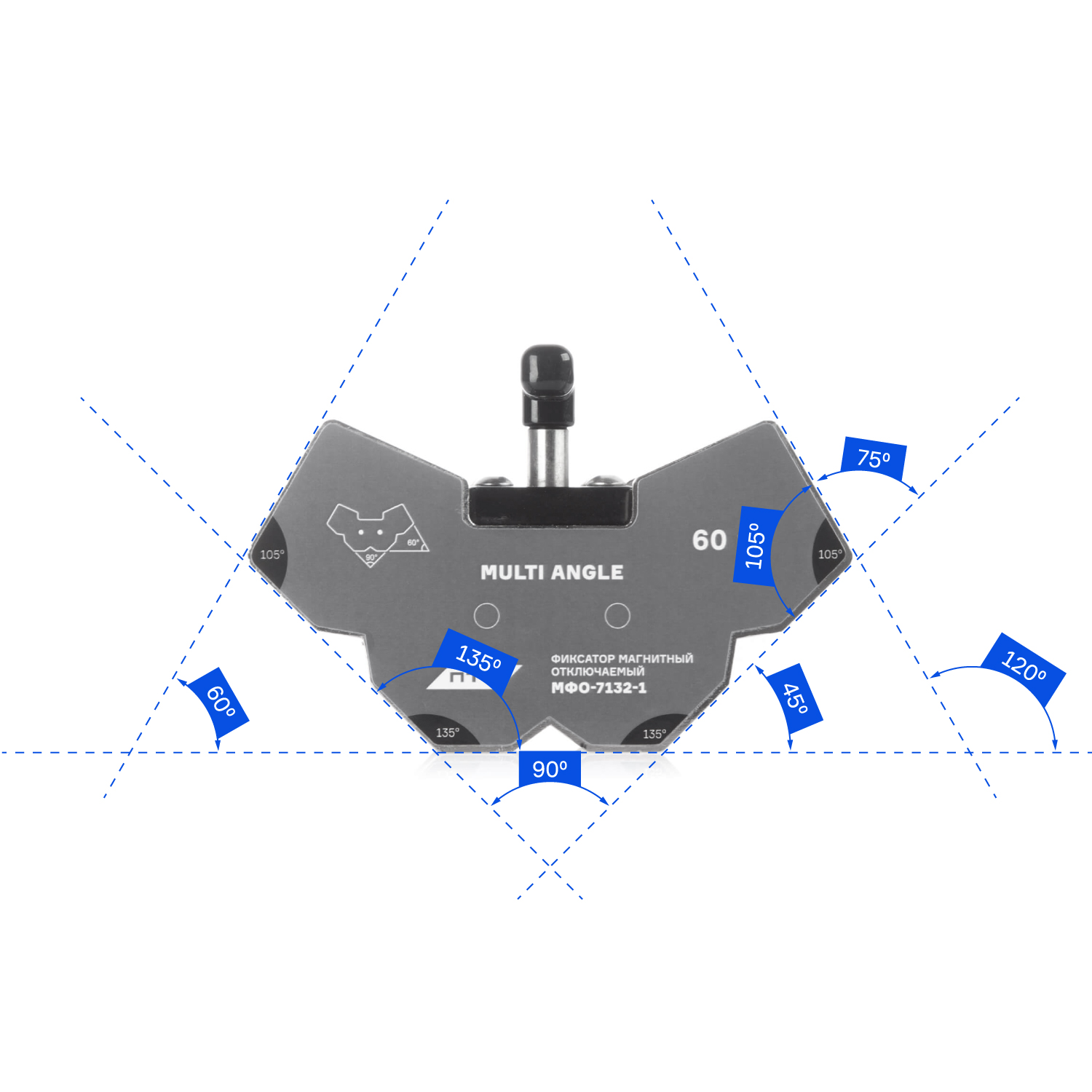Магнитный фиксатор позволяет производить точное выставление углов в процессе сварки, пайки и монтаже конструкций под 7 разными углами – 45°, 60°, 75°, 90°, 105°, 120°, 135°.