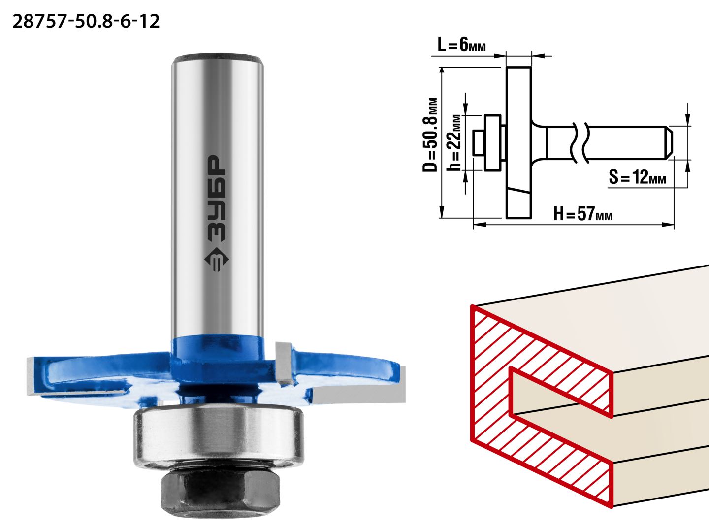 Фреза горизонтально-пазовая, D= 50,8мм, высота-6мм, хв.-12мм, d-22мм, ЗУБР Профессионал - 28757-50.8-6-12
