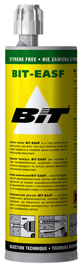 Химический анкер BIT-EASF - высокоэффективный двухкомпонентный химический состав на основе синтетической быстроотверждаемой эпокси-акрилатной смолы, не содержащей стирол и не имеющий запаха, в сочетании с металлическими анкерными элементами (резьбовыми шпильками, фундаментными болтами, арматурными прутками и т.п.). Химические анкеры BIT-EASF специально разработаны для осуществления анкерных креплений под высокие нагрузки в тяжелом и легком бетоне, железобетоне и природном камне с учетом физико-механических свойств, прочностных характеристик и коэффициентов температурного расширения данного класса строительных материалов.