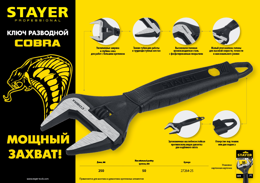 Ключ разводной COBRA, 250 / 50 мм, STAYER - 27264-25