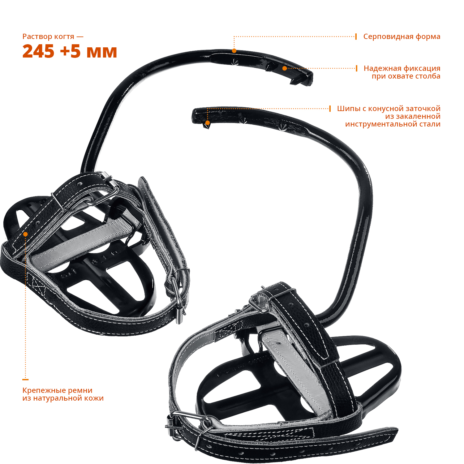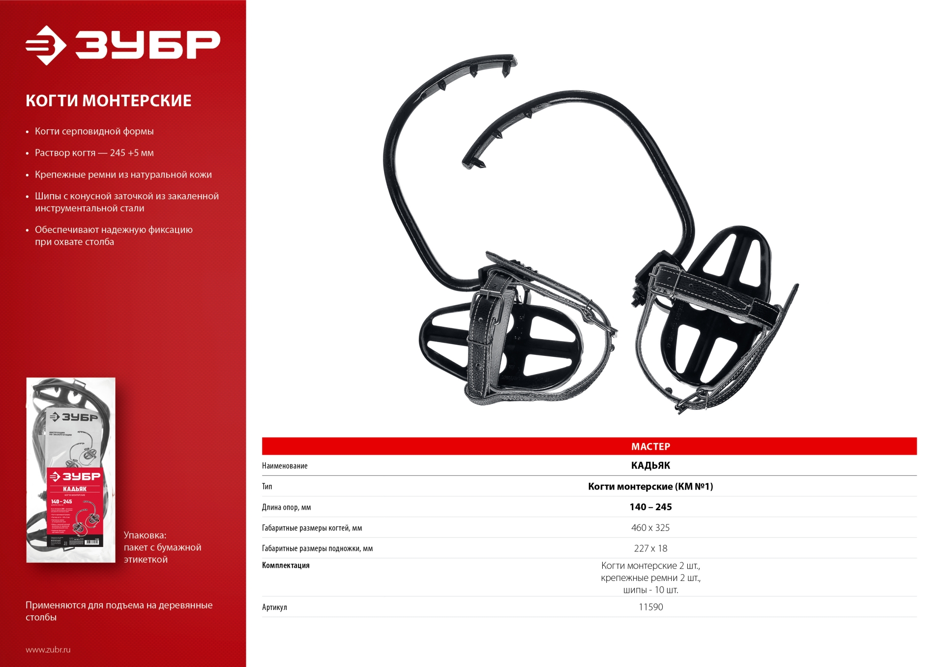 Когти монтерские ЗУБР 11590, предназначены для проведения ремонтно-монтажных работ. Крепежные ремни из натуральной кожи. Шипы с конусной заточкой выполнены из закаленной инструментальной стали. Обеспечивают надежную фиксацию при охвате столба.