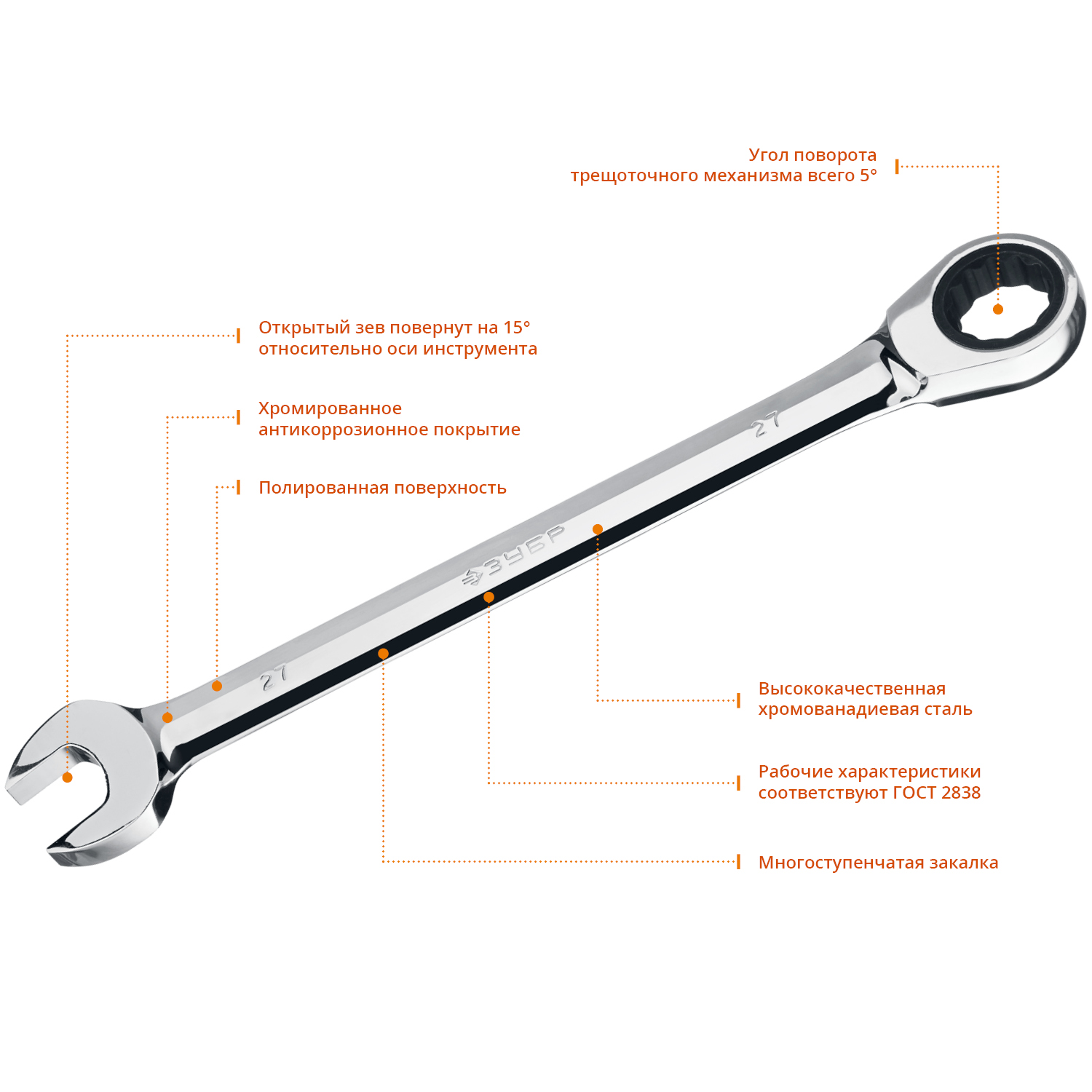 Комбинированный гаечный ключ, трещоточный 27 мм, ЗУБР - 27074-27