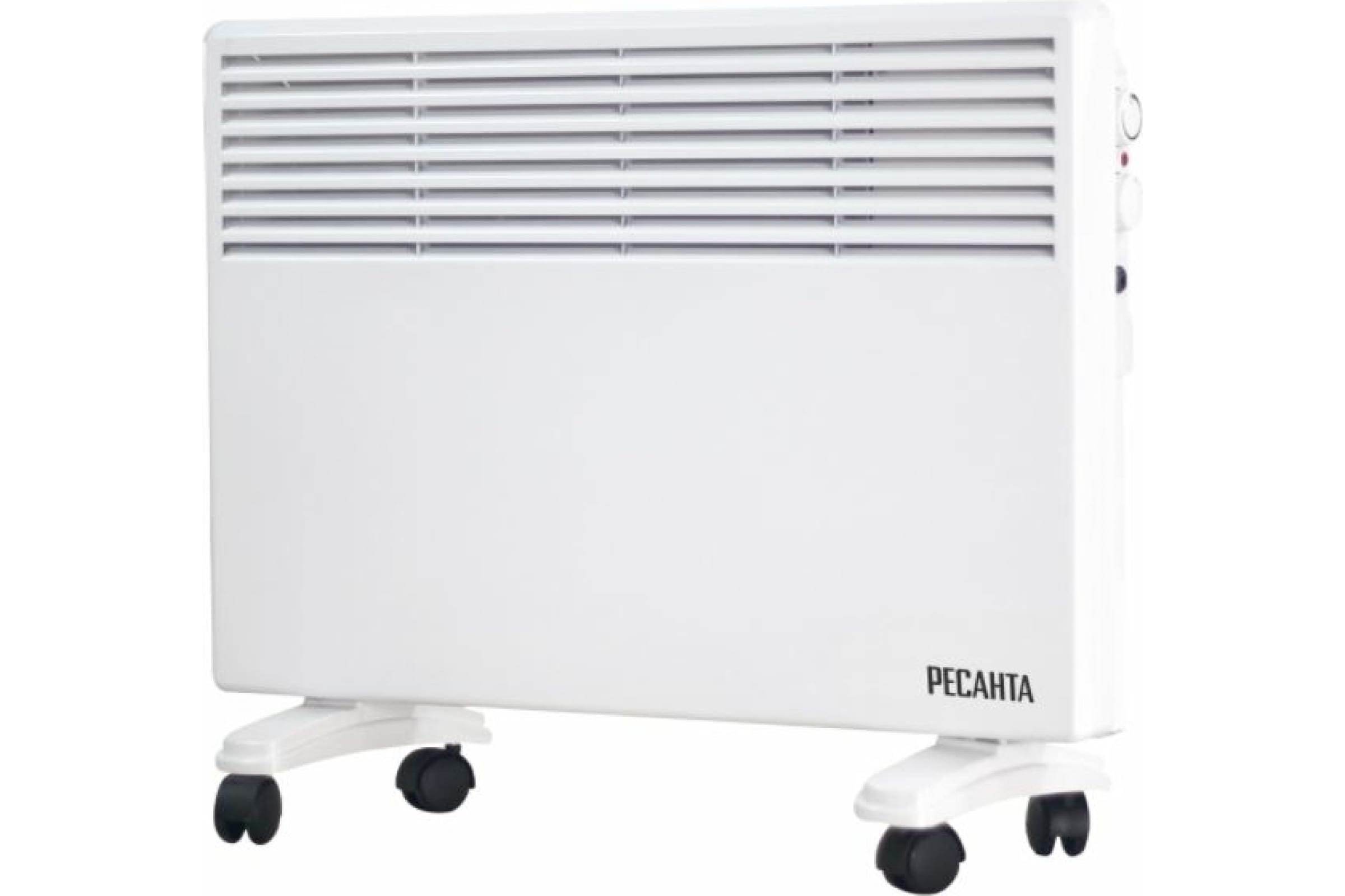 Конвектор Ресанта ОК-1500 67/4/23 - отопительное устройство для помещений до 20 кв.м. Обогрев комнаты осуществляется путем естественной конвекции. Помимо напольного монтажа конструкция предусматривает настенный монтаж. Крепеж для настенной установки в комплект поставки не входит. Для удобного передвижения устройство комплектуется колесиками. Поэтому пользователь может легко перемещать конвектор из одной комнаты в другую.