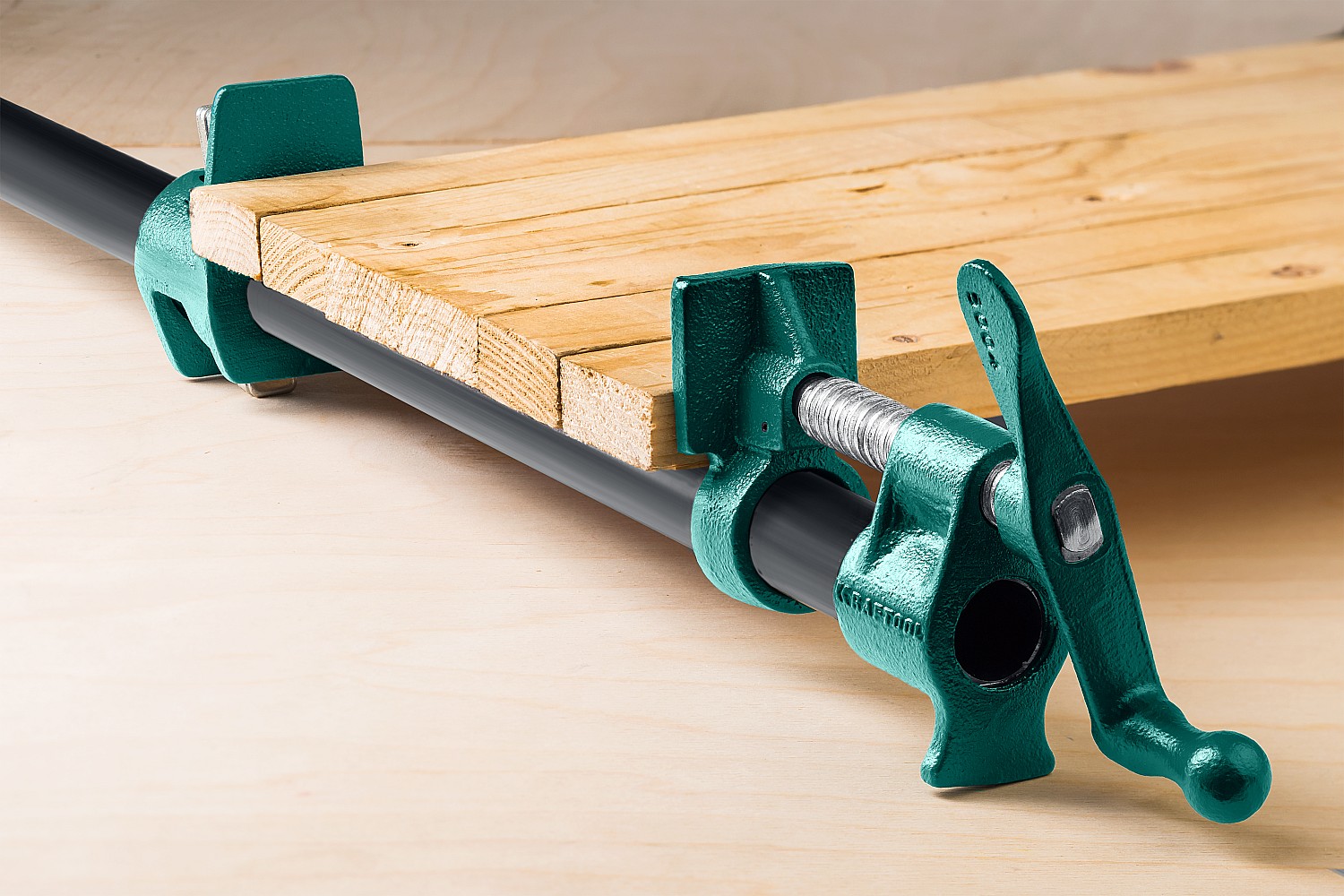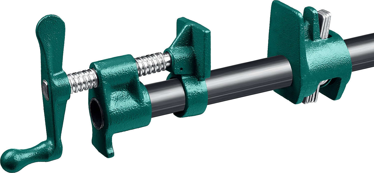 KRAFTOOL P-34 3/4", струбцина трубная — трубная струбцина с диаметром трубы 3/4 дюйма (около 26,9 мм) и глубиной захвата 45 мм, предназначенная для склеивания больших щитов, из которых обычно делают двери или столешницы. Изготовлена из прочного металла с порошковым покрытием, обеспечивающим защиту от коррозии и механических повреждений. Оснащена металлическими губками, которые не повреждают фиксируемые детали. Максимальное усилие сжатия достигает 500 кгс, что позволяет надежно фиксировать крупные и тяжелые заготовки. Струбцина оснащена удобной рычажно-поворотной рукояткой и широкими ножками в основании для максимального комфорта при работе. Инструмент подходит для профессионального использования в мебельном производстве и столярных мастерских.