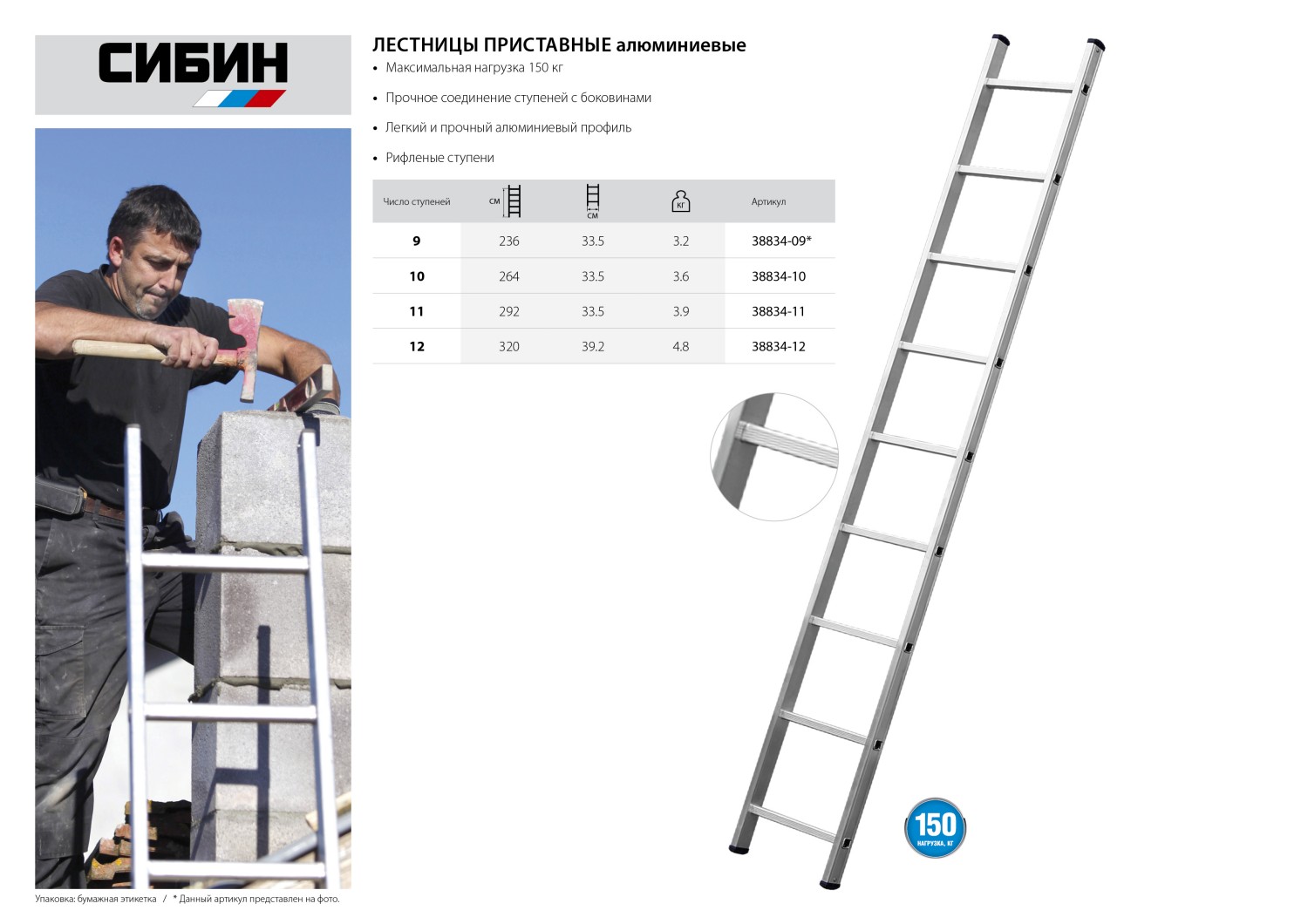 Лестница СИБИН приставная, 10 ступеней, высота 279 см - 38834-10