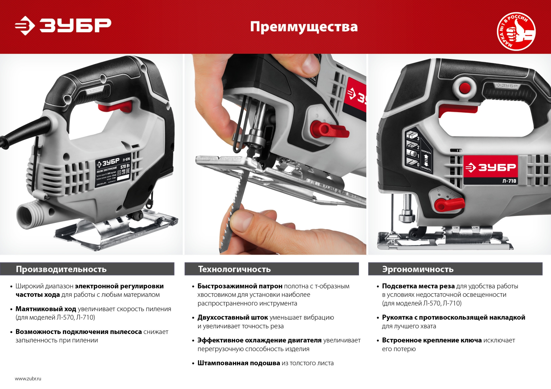 Лобзик электрический ЗУБР Л-400, предназначен для продольного, поперечного, косого и фигурного пиления заготовок из дерева, фанеры, ДСП, пластмасс и металла (при установке соответствующего полотна).