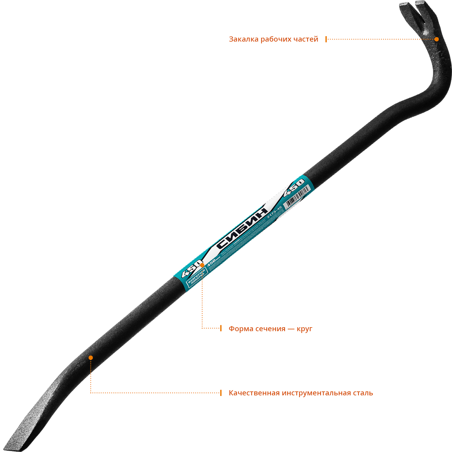 Круглый лом-гвоздодер СИБИН 2173-45, предназначен для демонтажа различных механизмов, конструкций, деталей, а также для извлечения гвоздей и строительных скоб. Изготовлен из высококачественной стали и закален.