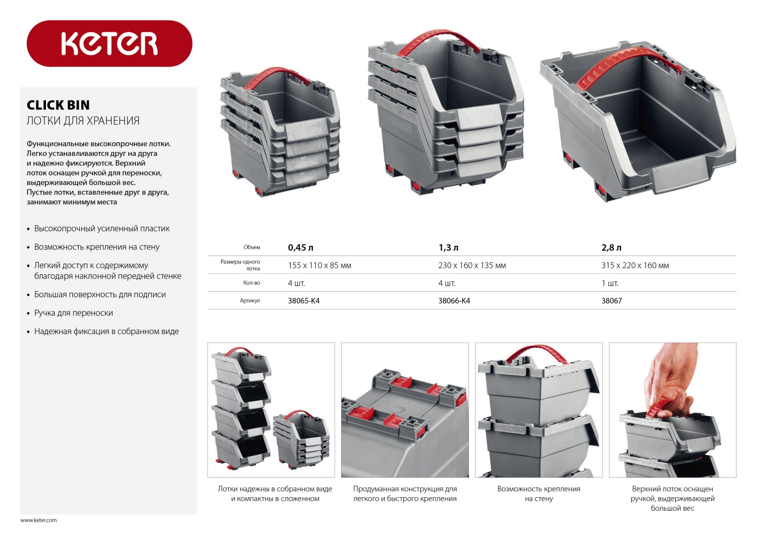 Лоток для метизов KETER 38067, предназначен для применения в быту. Компактное решение для хранения. Лотки хорошо входят друг в друга. Возможна установка их друг на друга за счет специальной системы крепления. Передняя часть лотка обеспечивает легкий доступ внутрь.