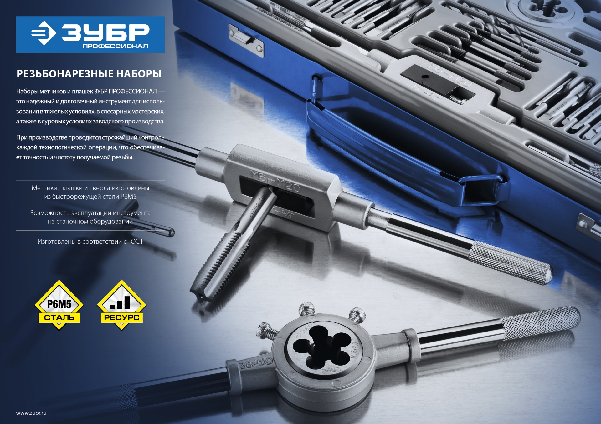 Наборы метчиков и плашек №1: 24 предмета «ЗУБР» ПРОФЕССИОНАЛ — это надежный и долговечный инструмент для использования в тяжелых условиях, в слесарных мастерских, а также в суровых условиях заводского производства. При производстве проводится строжайший контроль каждой технологической операции, что обеспечивает точность и чистоту получаемой резьбы.