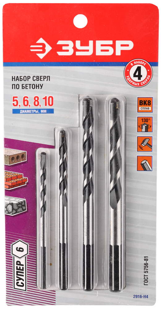 Набор сверл по бетону, ударные, "СУПЕР-6", с шестигранным хвостовиком, 5-6-8-10 мм, ЗУБР 4шт - 2916-H4