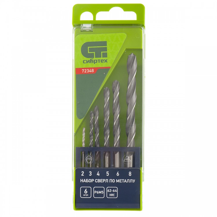 Набор сверл по металлу, 2 - 8 мм, 6 шт., Р6М5, пластиковый кейс // СИБРТЕХ - 72348