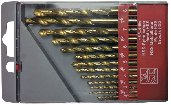 Сверла изготовлены из инструментальной стали с покрытием из нитрида титана. Коническая заточка. Цилиндрический хвостовик.