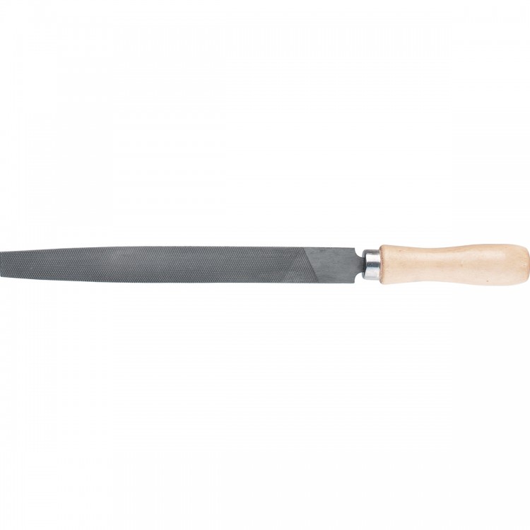 Напильник предназначен для качественной обработки плоских поверхностей твердых материалов. Инструмент имеет двойную перекрестную насечку №2. Ширина плоской части напильника уменьшается от середины к носу. Напильник изготовлен из углеродистой стали. Поставляется в комплекте с деревянной рукояткой, покрытой бесцветным лаком, который защищает древесину от рассыхания и набухания.