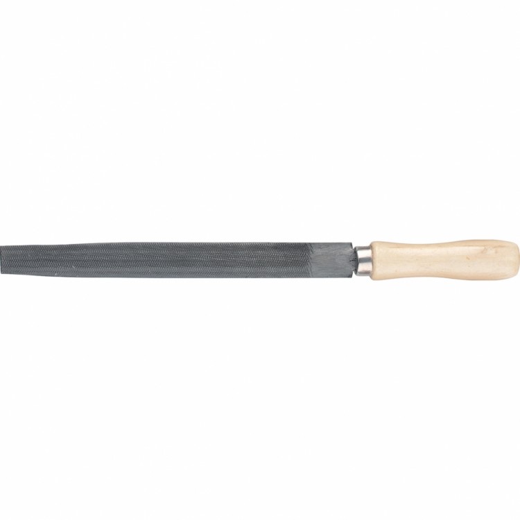 Напильник предназначен для качественной обработки плоских и круглых поверхностей твердых материалов. Инструмент имеет двойную перекрестную насечку №2. Площадь сечения напильника уменьшается от середины к носу. Напильник изготовлен из углеродистой стали. Поставляется в комплекте с деревянной рукояткой, которая покрыта бесцветным лаком, защищающим древесину от высыхания и набухания.