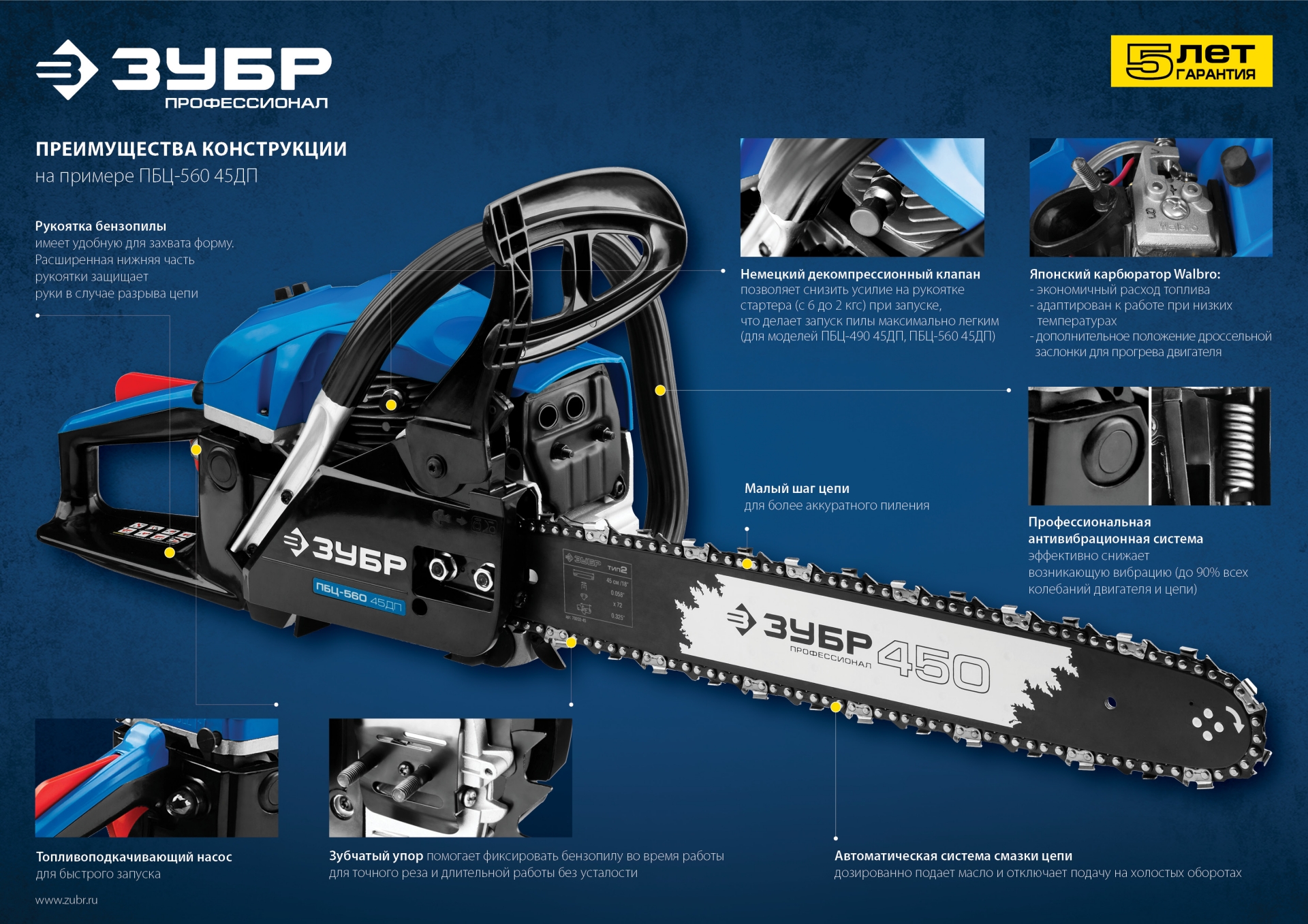 Бензопила Зубр ПБЦ-370 35П - идеальный помощник в саду. С ее помощью можно убирать лишние ветки кустов и деревьев. Электронная система зажигания обеспечивает ровную работу двигателя. Благодаря антивибрационная система снижается усталость пользователя во время работы. Основной тормоз мгновенного действия и вспомогательный инерционный тормоз, управляемый клавишей на рукоятке, обеспечивают высокую безопасность работы бензопилой.