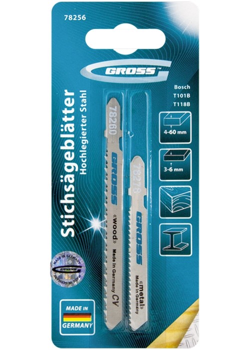 Полотна для электролобзика торговой марки GROSS изготовлены из высококачественной немецкой хромованадиевой стали и относятся к линейке профессионального инструмента. Отличительные особенности этой линейки: стойкость к изнашиванию, более высокая твердость по сравнению с обычными полотнами. При изготовлении полотен применяется лазерный раскрой профиля, процесс заточки и шлифовки полностью автоматизирован. Используются полотна в качестве режущего инструмента для распиловки изделий из твердой и мягкой древесины, фанеры, ламинированного ДВП и пластмассы. Полотно 78260 предназначено для чистого реза, а полотно 78268 — для быстрого реза. Полотна длиной 100 мм с шагом зуба 10 и 6 TPI прекрасно справляется с материалом толщиной от 4 до 60 мм. Набор упакован в жесткую термоформованную пленочную коробку (double blister).