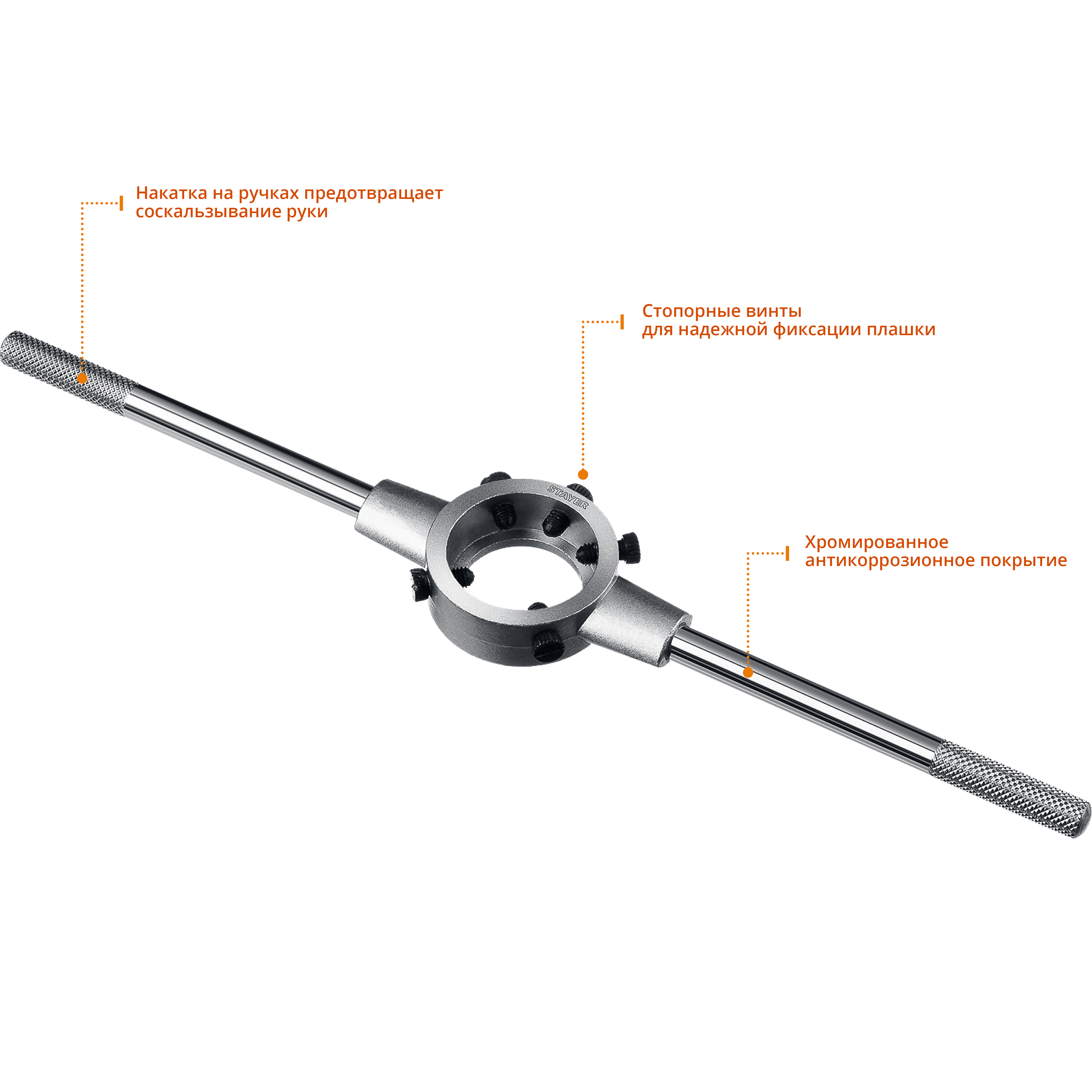 Плашкодержатель STAYER 28037-38_z01, предназначен для жесткой фиксации плашек размером 38 мм при ручных резьбонарезных работах.