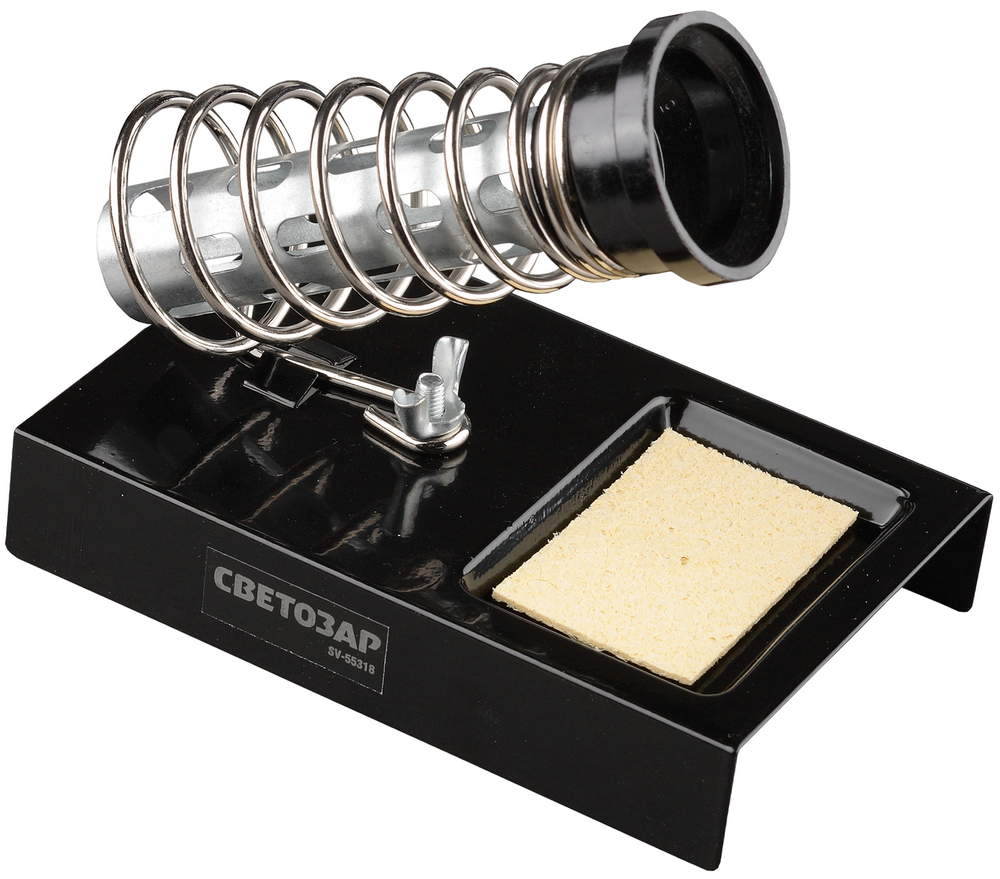 Подставка оснащена прочным основанием обеспечивающим удобство при осуществлении паяльных работ. Паяльник надежно фиксируется в направляющей подставки. Подставка оснащена специальным ковриком для очистки жала паяльника.