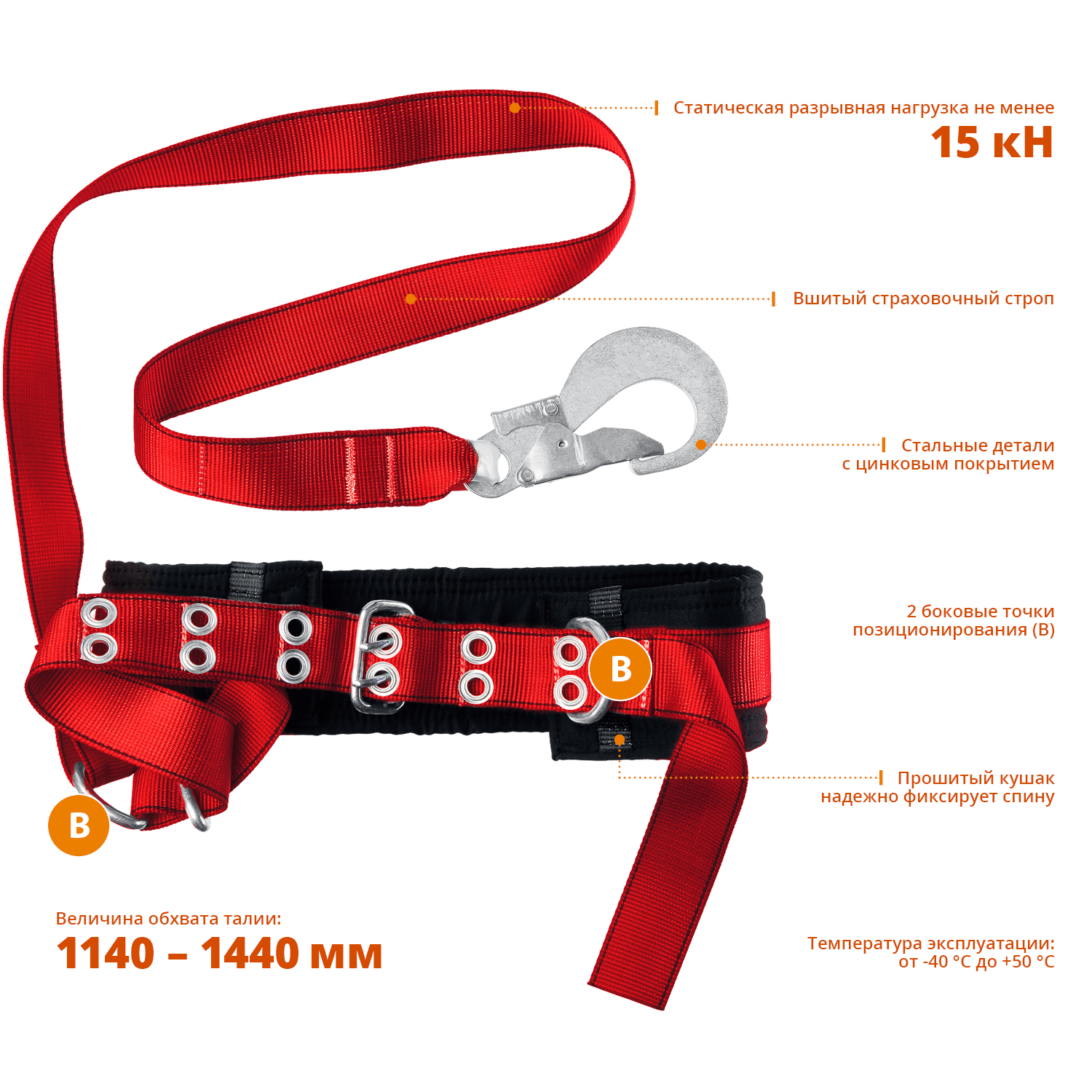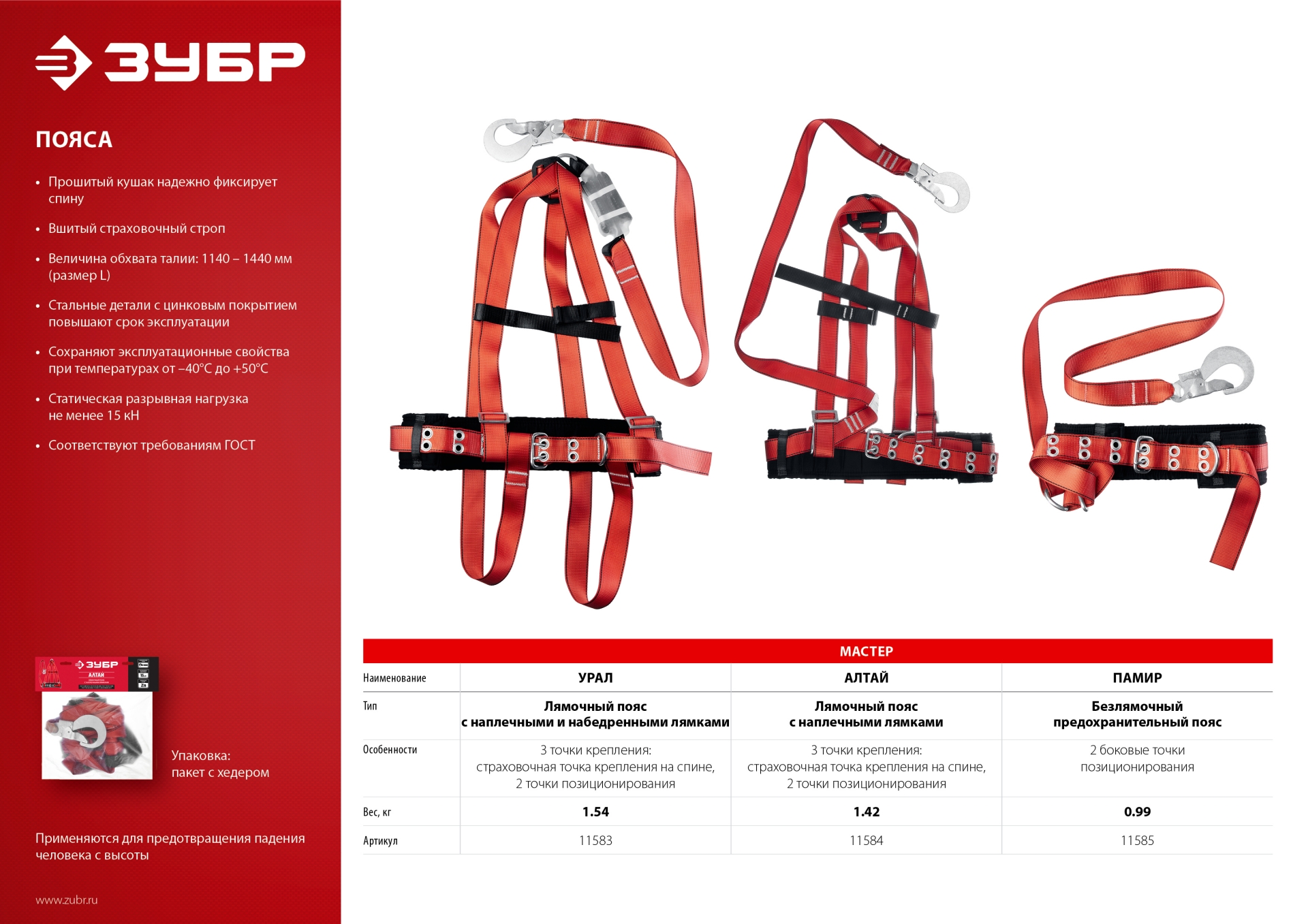 Технические характеристики безлямочного предохранительного пояса Зубр Памир ленточный строп 11585