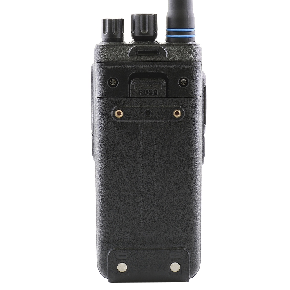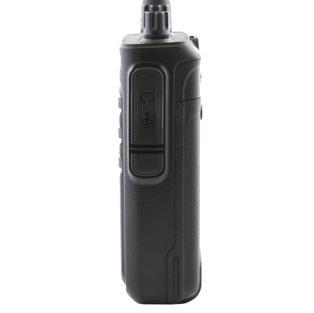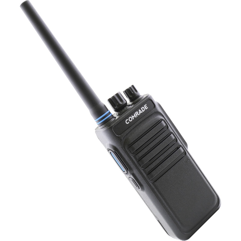 Comrade R5 VHF - портативная радиостанция работает в диапазоне 136-174 МГц и имеет память на 16 каналов связи. На передней панели устройства расположен динамик, микрофон и светодиодный индикатор состояния рации. На левой стороне расположены две кнопки правления рацией: РТТ и MONI, на правой - разъем подключения аксессуаров, закрытый резиновой заглушкой.