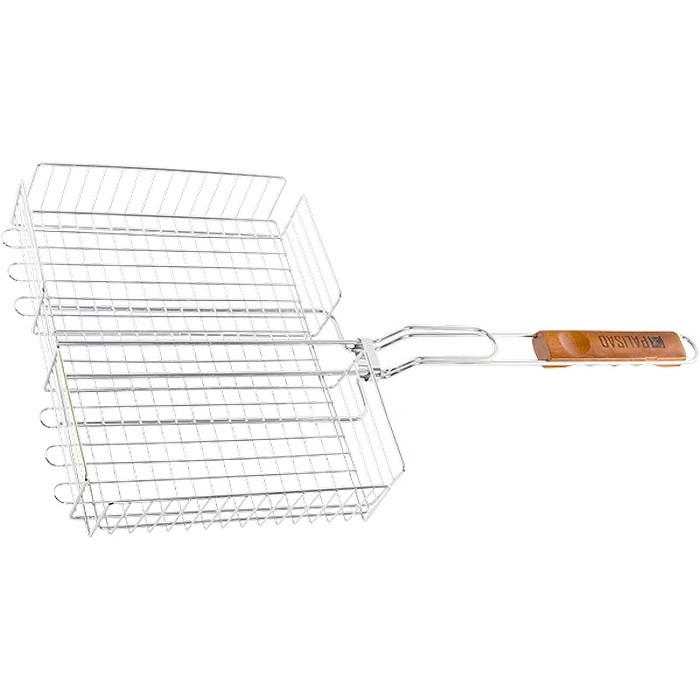 Высококачественная жаропрочная сталь. Эргономичная рукоятка. Широкое кольцо-фиксатор. Конструкция объемной решетки-гриль позволяет фиксировать верхнюю плоскость на разной высоте, поэтому на решетке можно запекать продукты различной толщины — от стейков до куринных окорочков, не передавливая их и оставляя сочными.