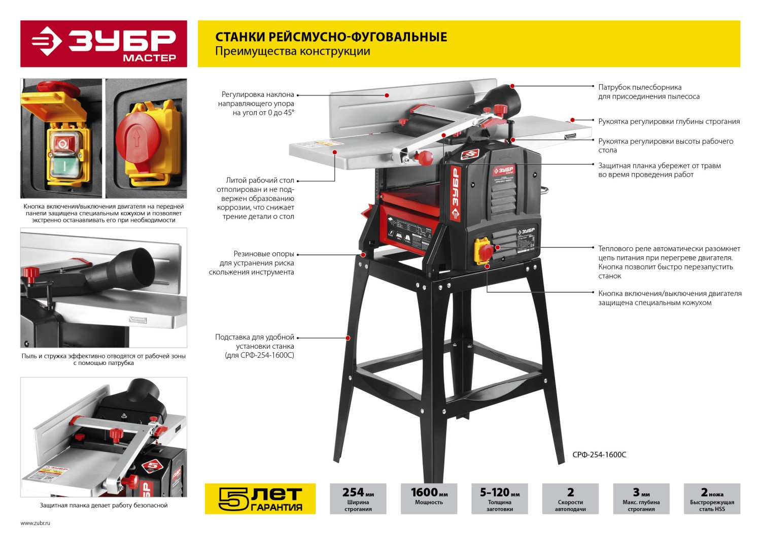 Рейсмусно-фуговальный станок ЗУБР МАСТЕР СРФ-204-1500 предназначается обработки изделий из древесины. Установка позволяет выполнять следующие виды операций: строгание по плоскости или под заданным углом, а также рейсмусование. Двигатель станка имеет защиту от перегрузок, что значительно продлевает срок службы. Благодаря двум стальным ножам устройство способно работать с древесиной как твердых, так и мягких пород.