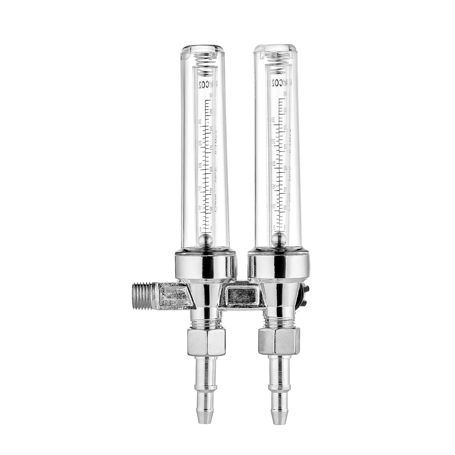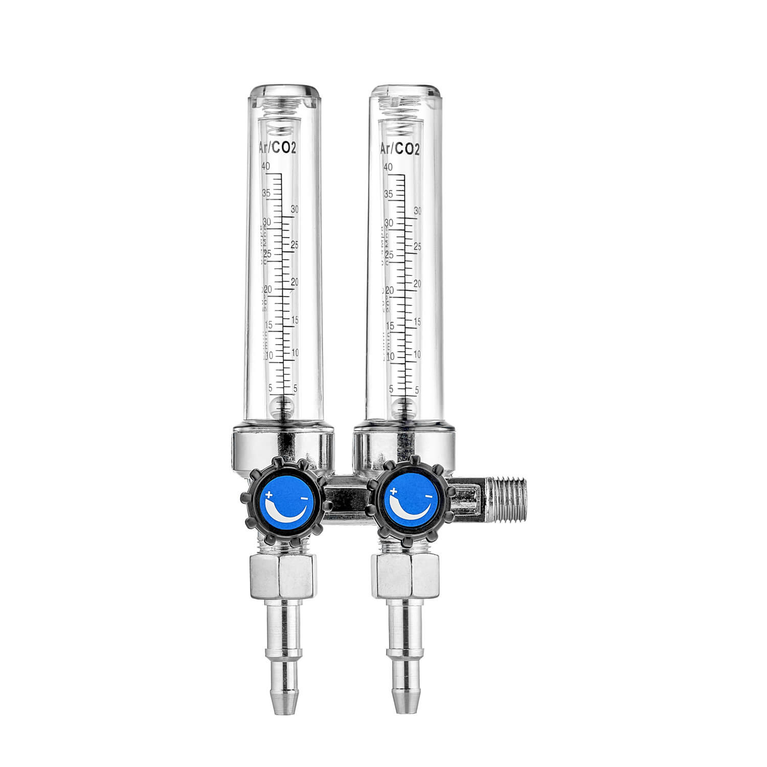 Корпус ротаметра изготовлен из силумина, а колба ротаметра из прочного пластика. Внутри колбы расположена стеклянная трубка для шарика-поплавка. На трубке нанесена двойная шкала расхода газов Ar/CO2, которая показывает расход каждого из них (л/мин).