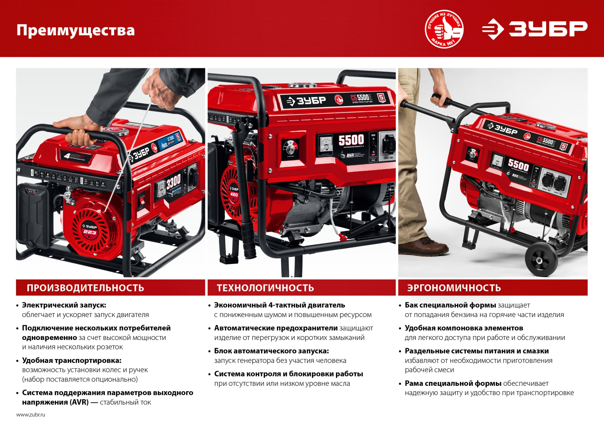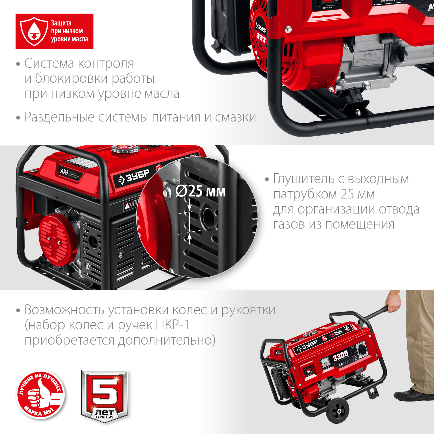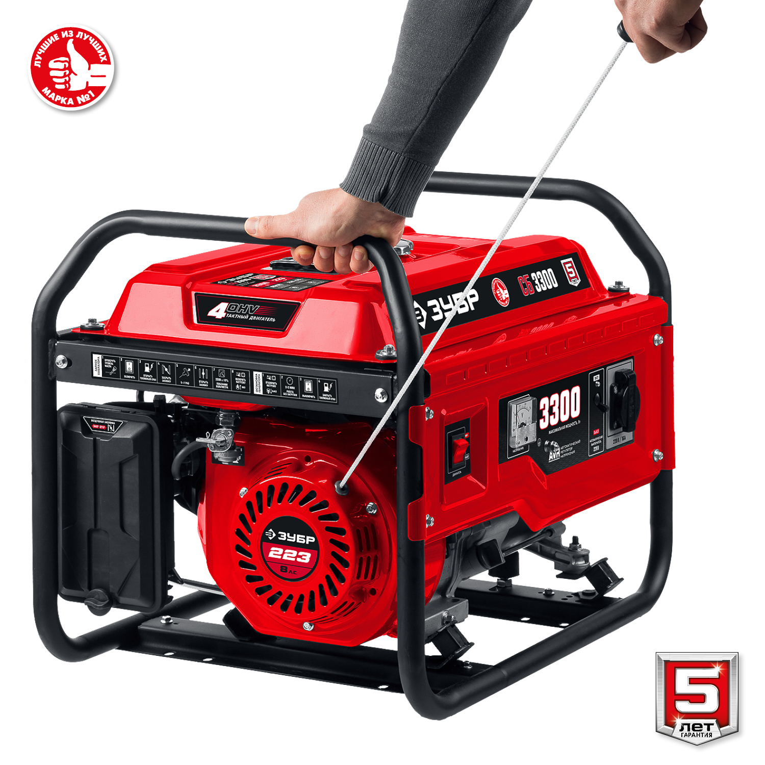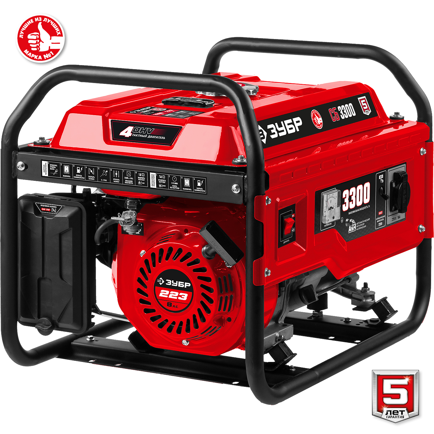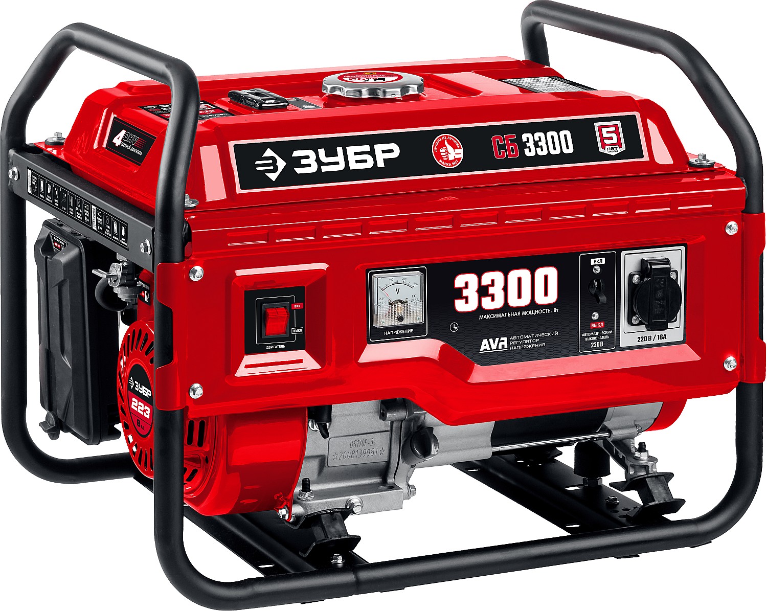 СБ-3300 бензиновый генератор, 3300 Вт, ЗУБР — это надежный и удобный источник электроэнергии для дома, дачи, мастерской или стройки. Максимальная мощность — 3300 Вт, номинальная — 3000 Вт. Генератор оснащен четырехтактным двигателем, топливный бак объемом 15 литров обеспечивает до 8 часов автономной работы. Прочная рама облегчает транспортировку и защищает агрегат. На панели управления расположены розетки, индикаторы и автомат защиты. Генератор подходит для питания электроинструментов, освещения, бытовых приборов. Ограничения — не рекомендуется для особо чувствительной техники, требует регулярного обслуживания.
