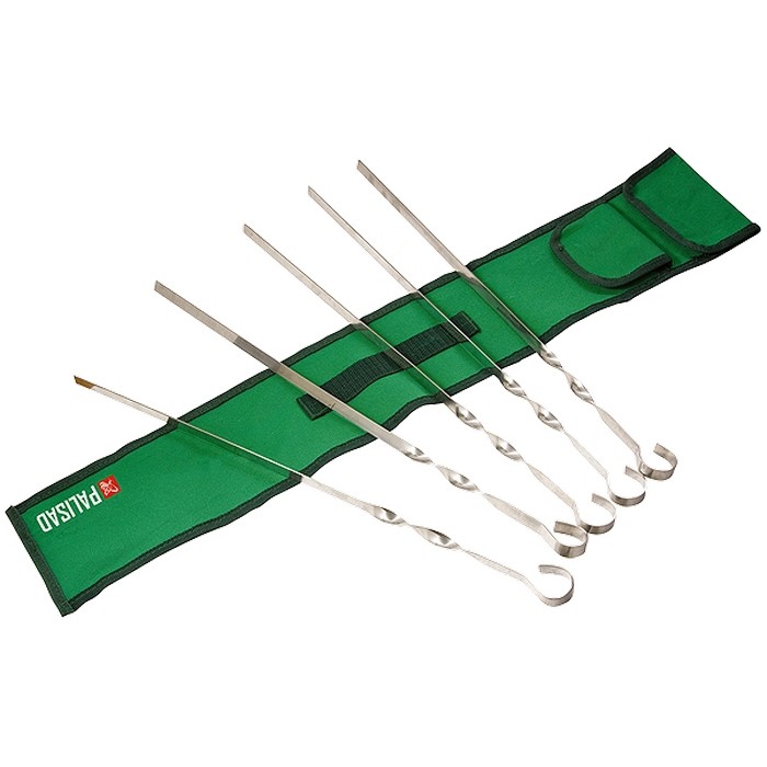 В комплекте 6 шампуров, нейлоновый чехол. Длина: 450 мм. Ширина: 10 мм. Толщина: 1,5 мм. Все шампуры изготовлены из пищевой нержавеющей стали марки 2Сr13. Толщина шампуров составляет 1,5 мм, благодаря чему они не деформируются и не прогибаются под тяжестью продуктов. Винтовые ручки на шампурах, легко проворачивающиеся в прорезях мангала, обеспечивают максимально равномерное приготовление продуктов. Чехол в комплекте удобен для хранения набора и особенно для его транспортировки.