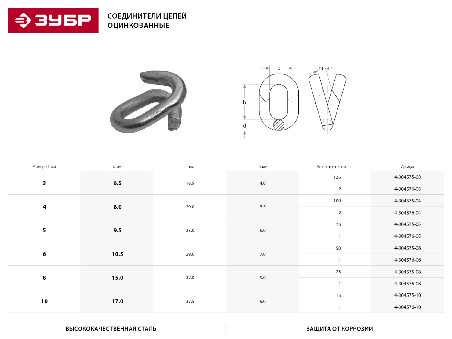 Соединитель цепей ЗУБР, оцинкованный, 3мм, ТФ6, 2 шт - 4-304576-03