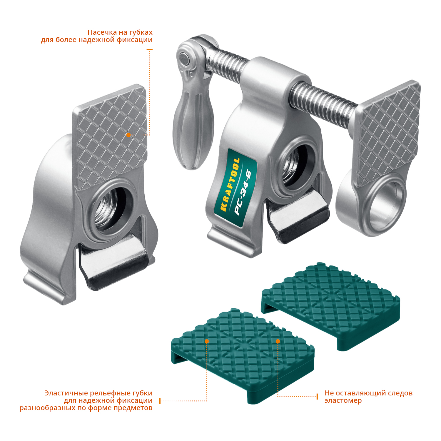 Струбцина трубная PC-34-6 KRAFTOOL, предназначена для склеивании больших щитов, из которых обычно делают двери или столешницы. Неограниченная ширина захвата - надежный зажимной/распорный инструмент. Удобная рычажно-поворотная рукоятка, широкие ножки в основании, мягкие накладки на губки - обеспечивают максимальный комфорт при выполнении работ.