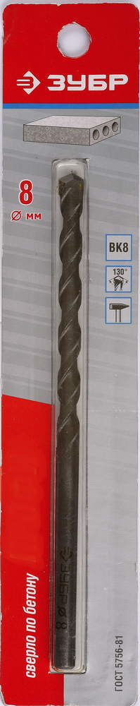 Шливованный шестигранный хвостовик недопускает проворачивание сверла в сверлильном патроне.Сверла по бетону ЗУБР серии МАСТЕР – Ваш надежный и проверенный инструмент в быту и строительстве. Применяются для работ по бетону, граниту, природному и искусственному камню, кирпичной кладке.-Диаметр сверла: 8,0 мм