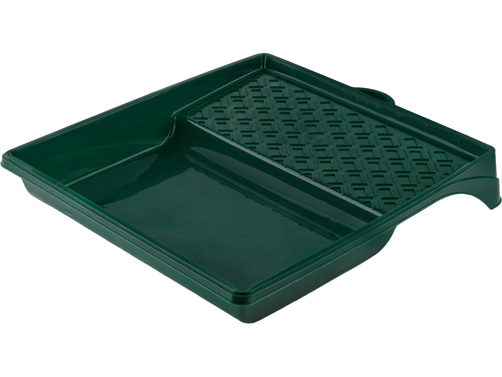 Описание: изделие выполнено из ударопрочного пластика, устойчивого к действию растворителей, позволяет использовать большинство ЛКМ. Конструкция двухуровневая - углубление для краски и рифленая площадка для валика. Изделие оснащено ножками для устойчивости и кронштейном для крепления под крюк,