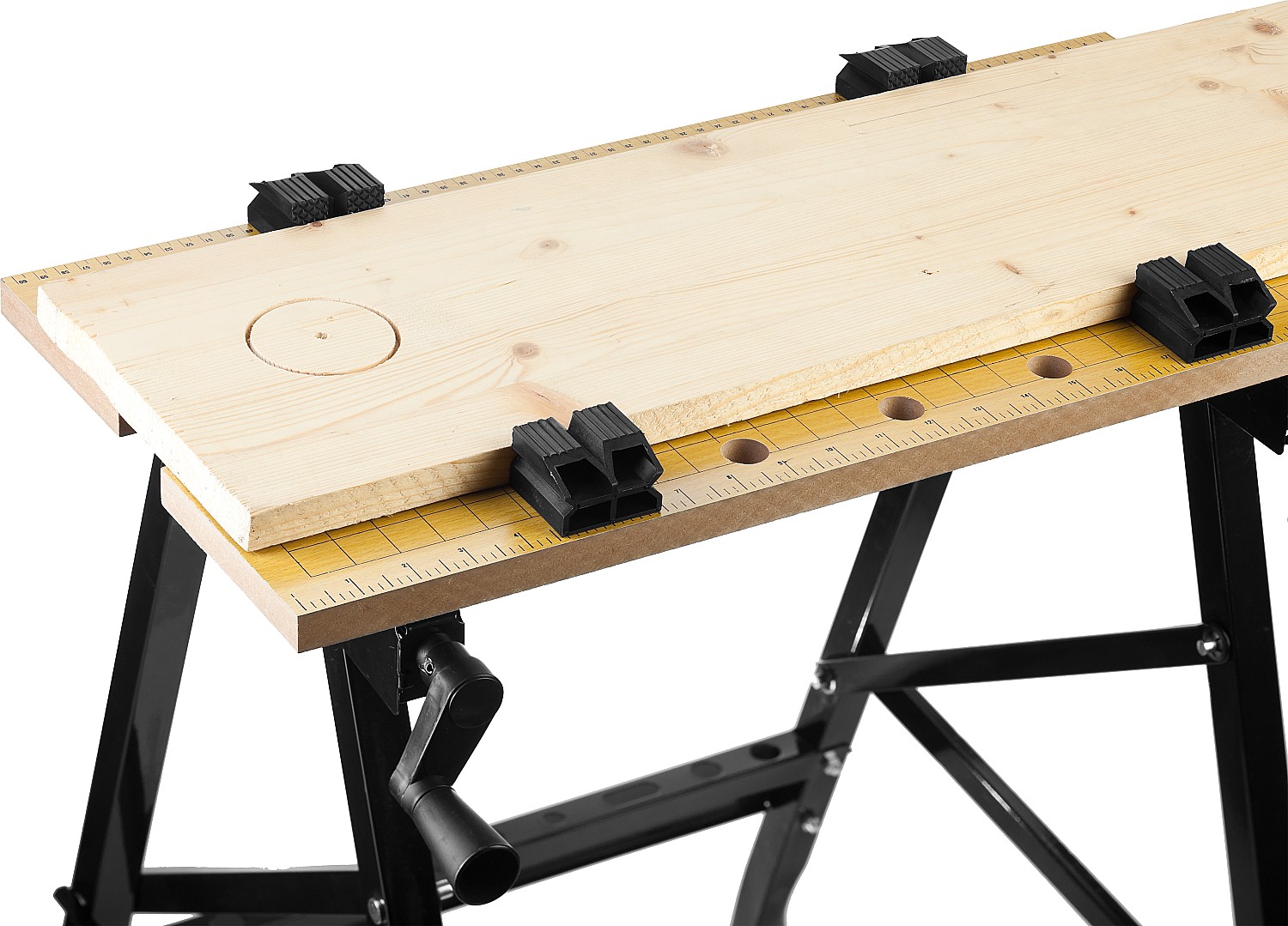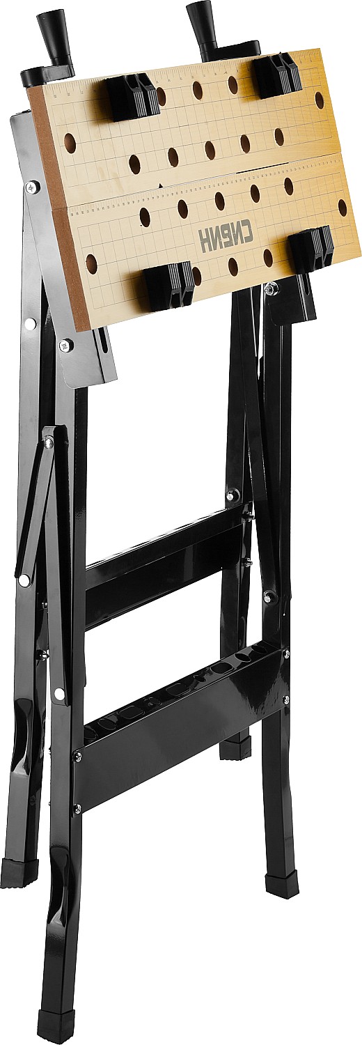 Практичный переносной верстак с регулируемым по ширине столом для столярных и слесарных работ. Имеет надежную и устойчивую конструкцию. Благодаря складному каркасу удобен при транспортировке и не занимает много места при хранении. Столешница состоит из двух створок – статичной и подвижной, что позволяет регулировать ширину стола. Регулировка ширины стола и фиксация подвижной створки производится двумя вращающимися ручками. В комплект поставки входит четыре пластиковых упора для зажима заготовок. Большое количество отверстий в столешнице позволяет установить упоры в необходимых местах.