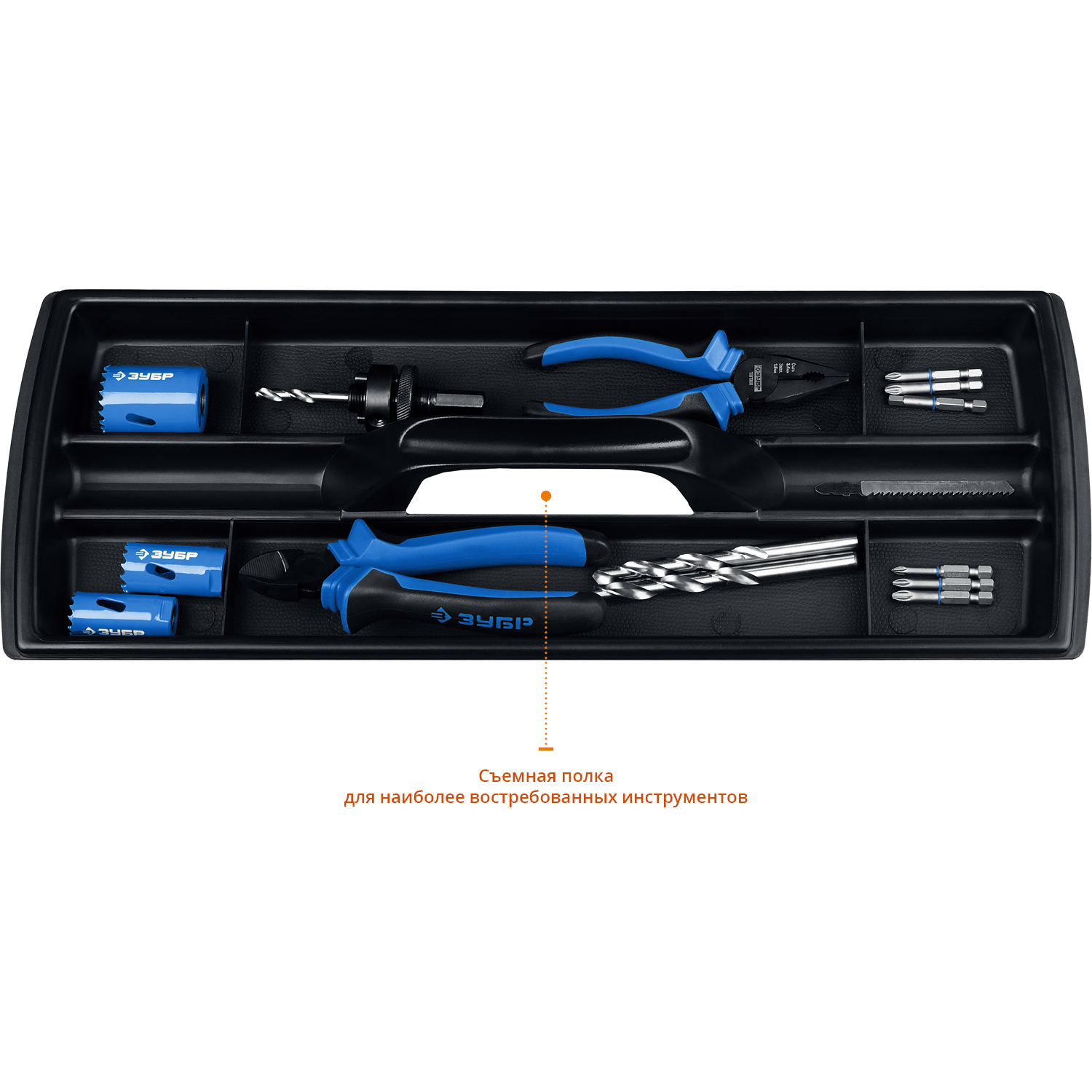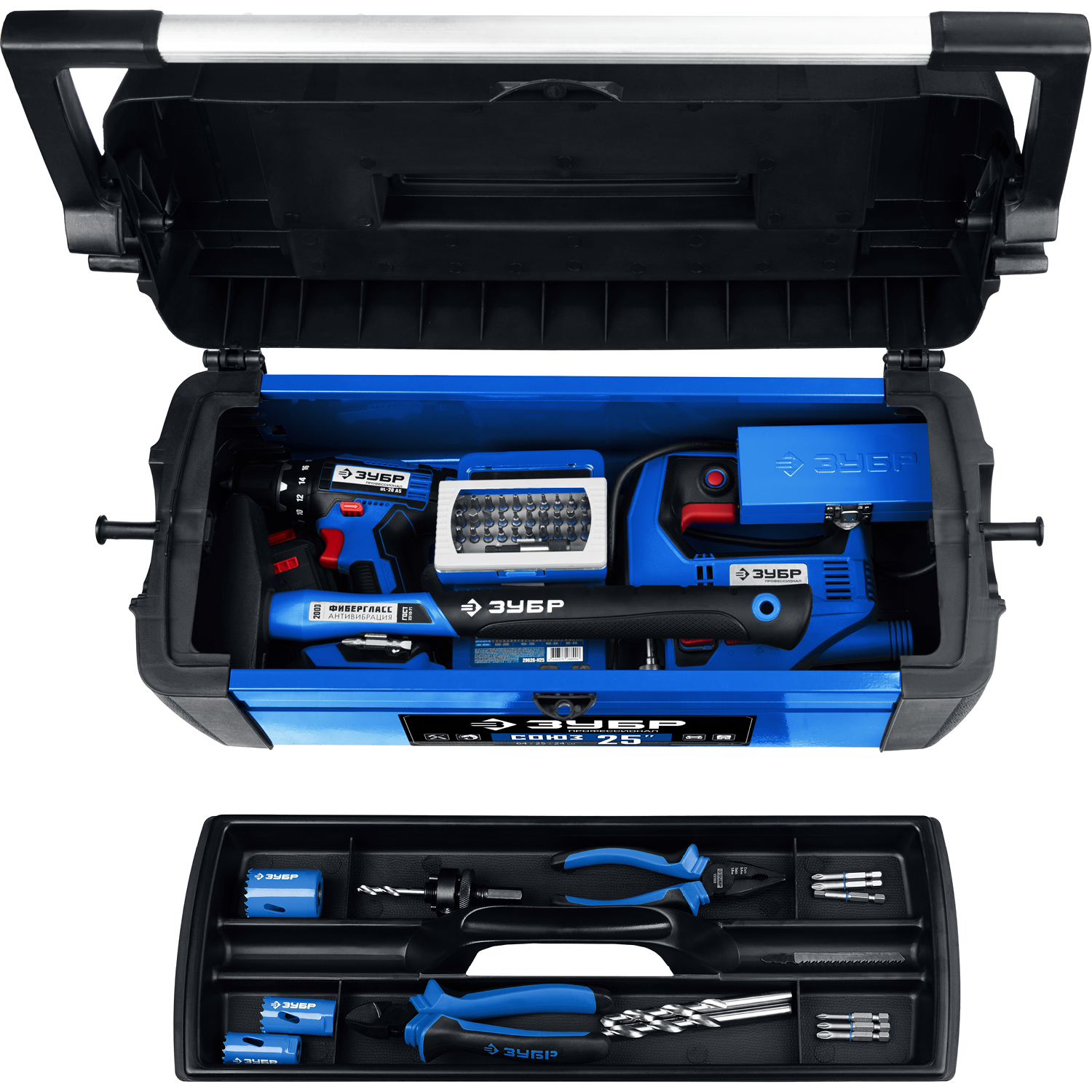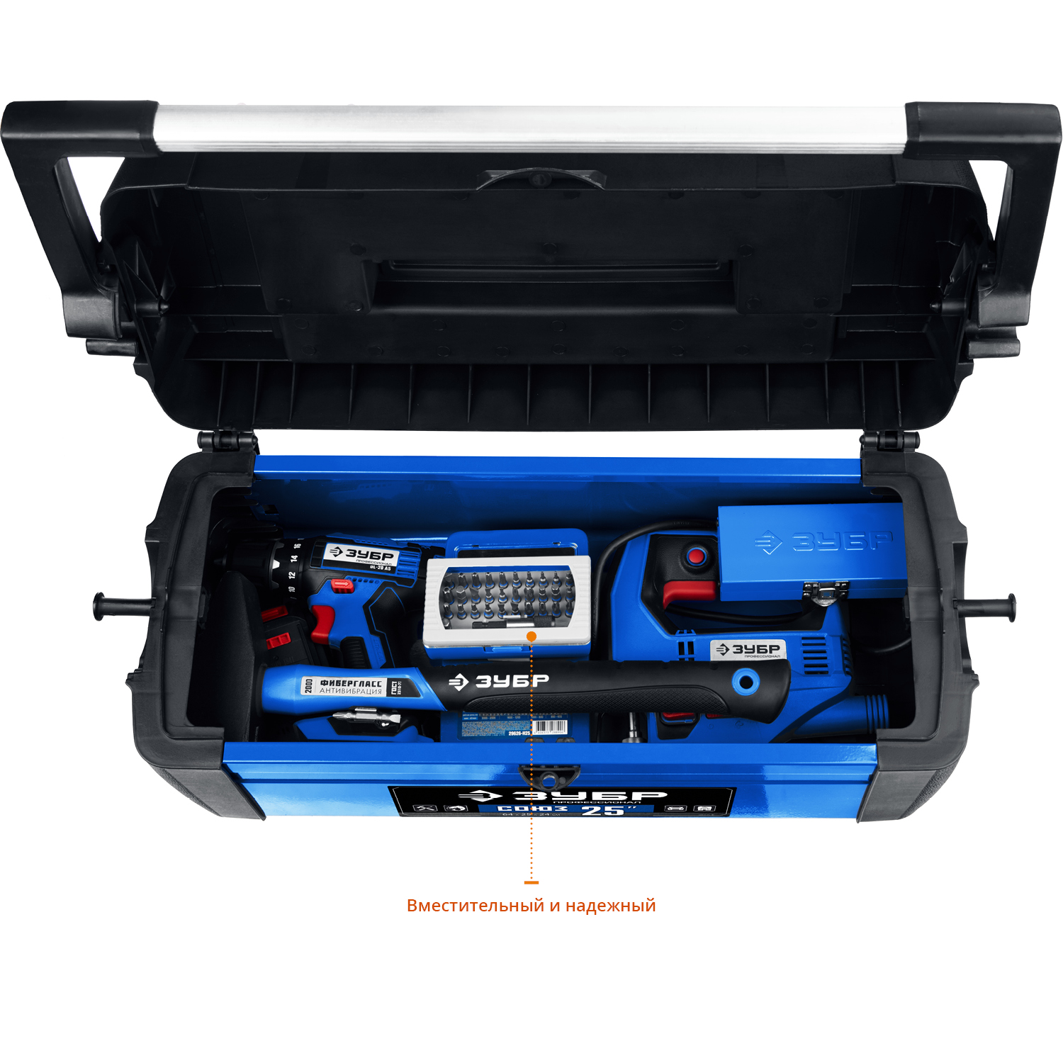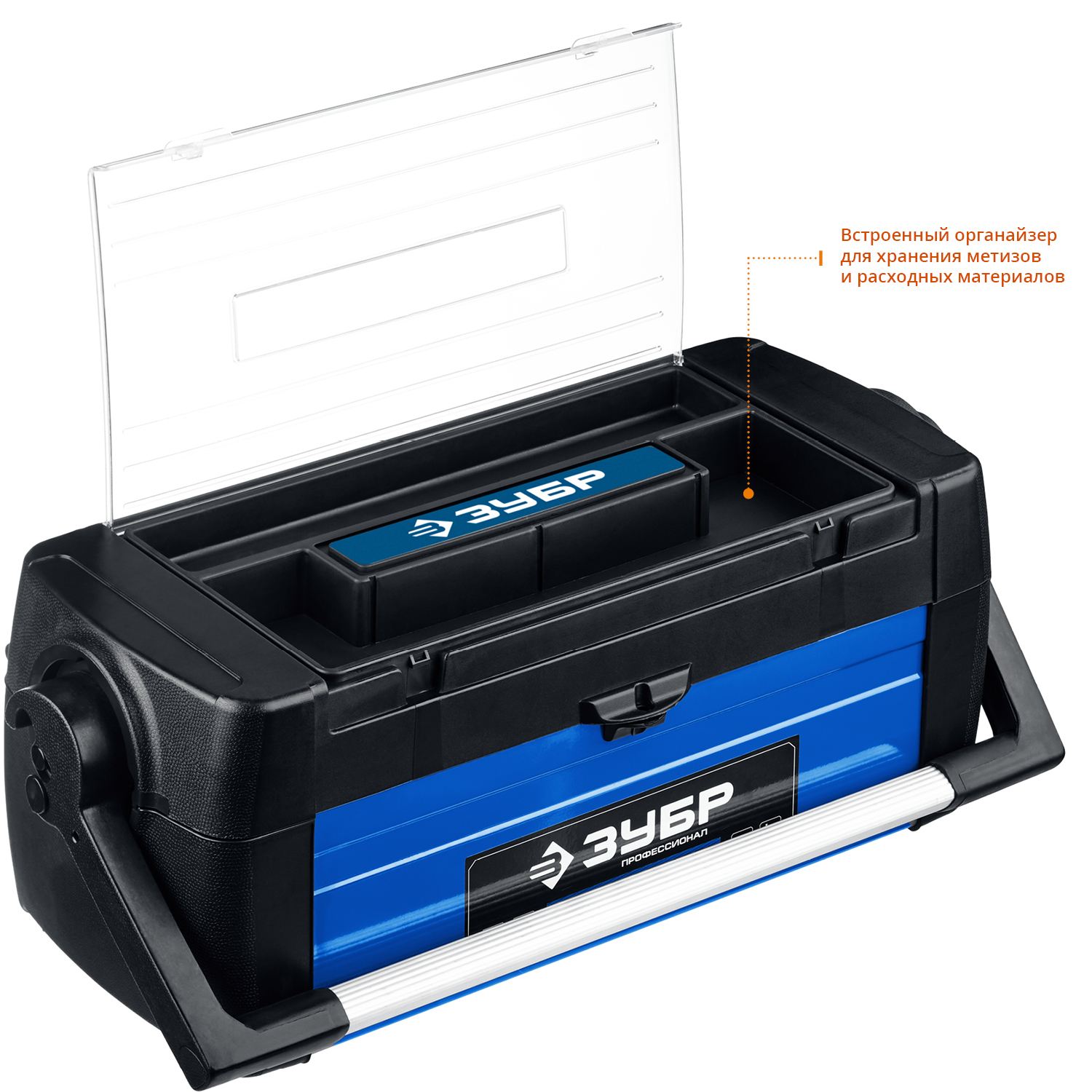 Ящик для инструмента ЗУБР 38151-25_z01, применяется для хранения инструментов и принадлежностей. Металлический корпус. Съемная полка для размещения мелких предметов или самых востребованных инструментов. Встроенный органайзер для хранения метизов и расходных материалов. Широкая металлическая ручка для регулировки центра тяжести ящика при переноске.