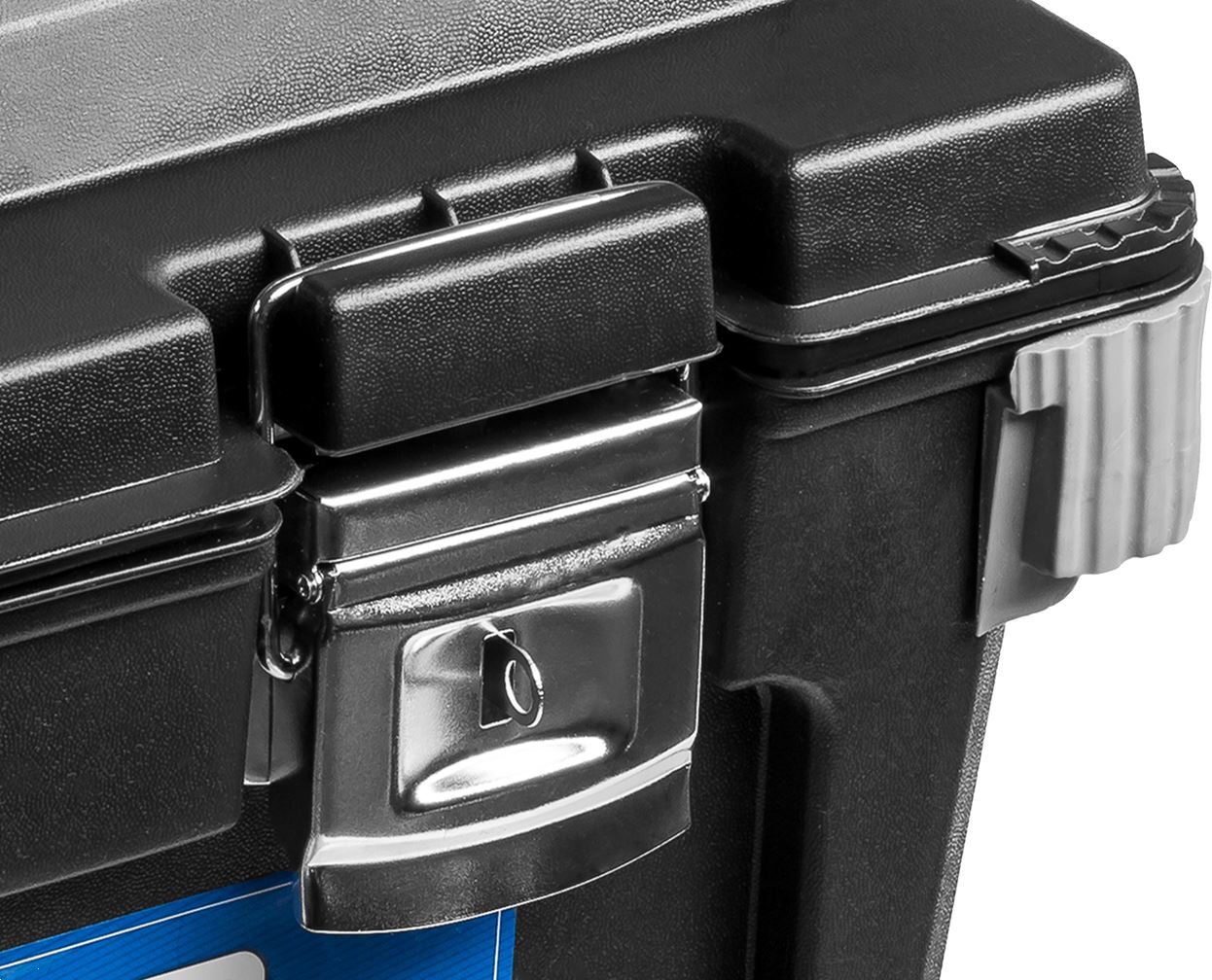 Ящик для инструмента ЗУБР 38141-20_z01, применяется для хранения инструментов и принадлежностей. Прочный ящик с усиленными стенками и съемной полкой позволят организовать удобное хранение инструментов, а благодаря широкой ручке смещать центр тяжести ящика, если это необходимо при его переноске. Широкая металлическая ручка для регулировки центра тяжести ящика при переноске. Антиударные угловые накладки. Металлические замки для надежного запирания ящика во время переноски.