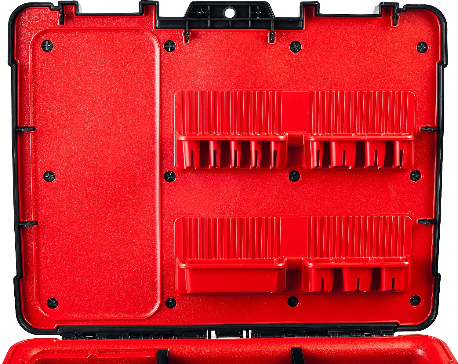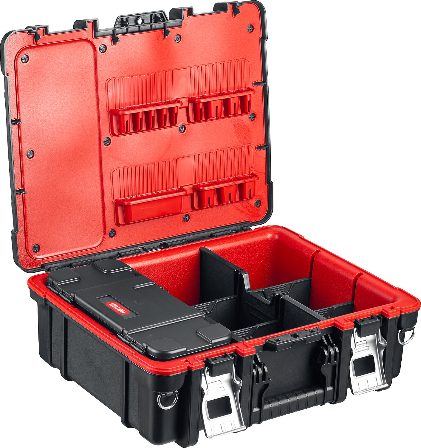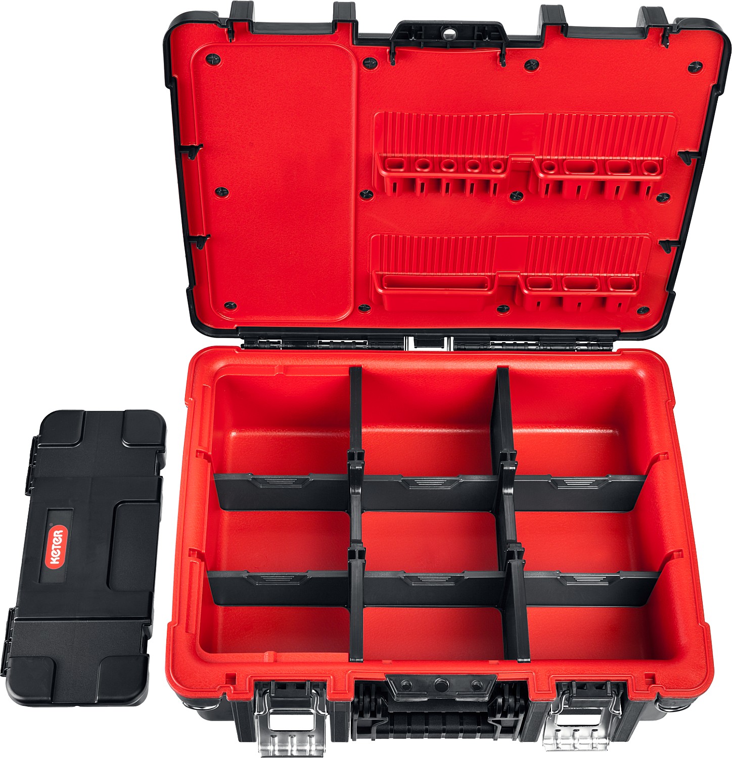 Профессиональный ящик для ручного инструмента и расходных материалов имеет утолщенные стенки с дополнительными ребрами жесткости, а также уникальную вставку из мягкого пластика для бережного хранения содержимого. Переставные перегородки, съемный органайзер и отделения в крышке.